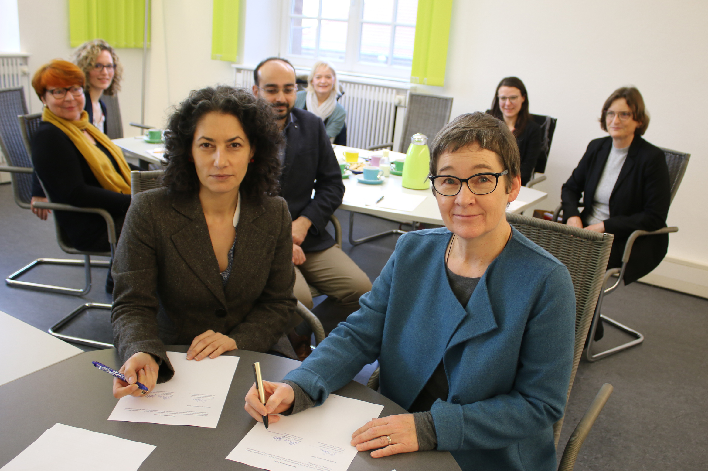 Unterschriften unter die Zielvereinbarung: Kassels Bildungsdezernentin Ulrike Gote (rechts) und die Leiterin Dr. Elisabeth Aram, von der Transferagentur Hessen.