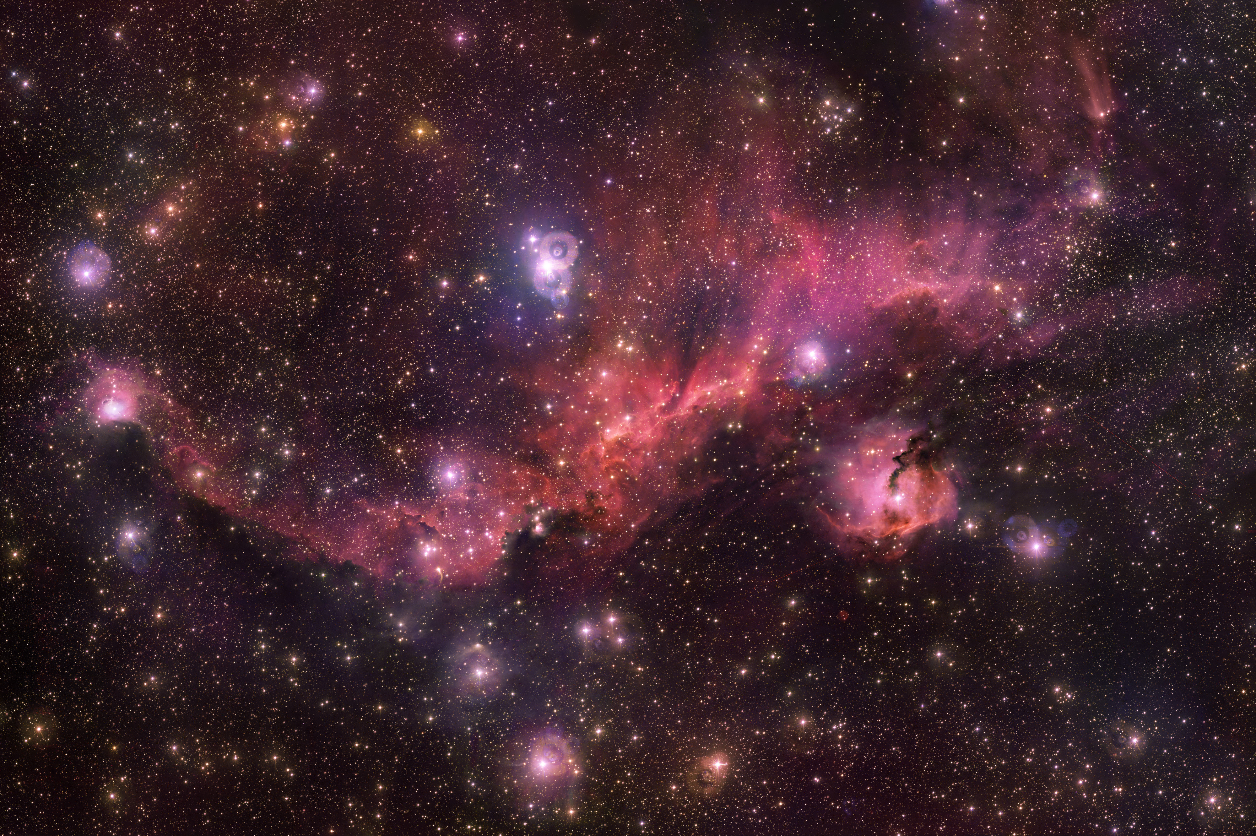 Farbenfroh und zart schillernd bildet Sharpless 2-296 die „Flügel“ eines Himmelsbereichs, der als Möwennebel bekannt ist – benannt nach seiner Ähnlichkeit mit einer Möwe im Flug. Dieser himmlische Vogel enthält eine faszinierende Mischung aus interessanten astronomischen Objekten. Leuchtende Wolken tauchen inmitten dunkler Staubbahnen und heller Sterne auf. Der Möwennebel ist die heiße und energiereiche Geburtsstätte neuer Sterne.