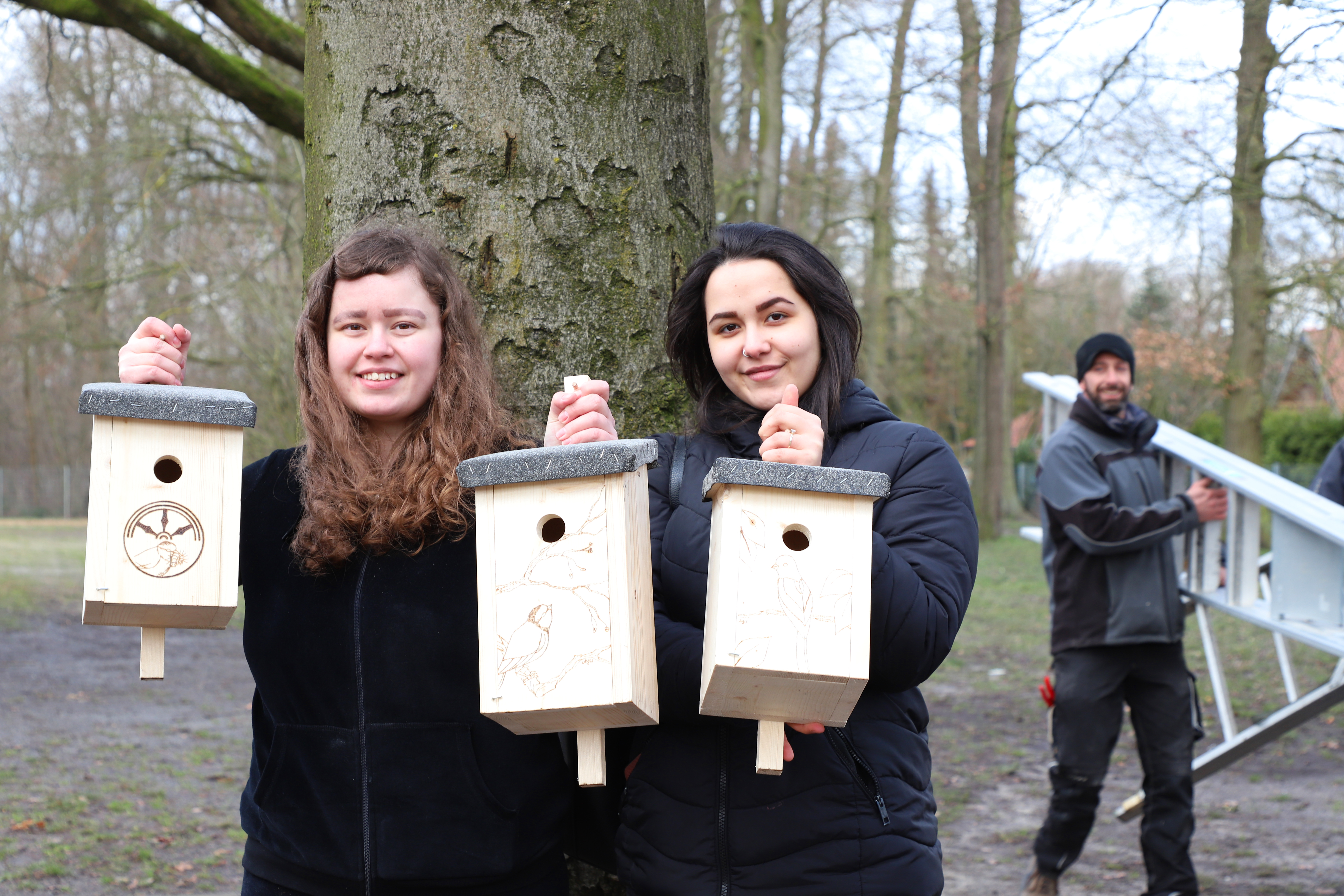 Aygül „Ayu“ Hatunoglu (links) hat die Zeichnungen auf den Kästen entworfen und präsentiert sie zusammen mit Sara Salem Teixeira. Beide sind Teilnehmerinnen im Zentrum für Jugendberufshilfe Dammstraße.