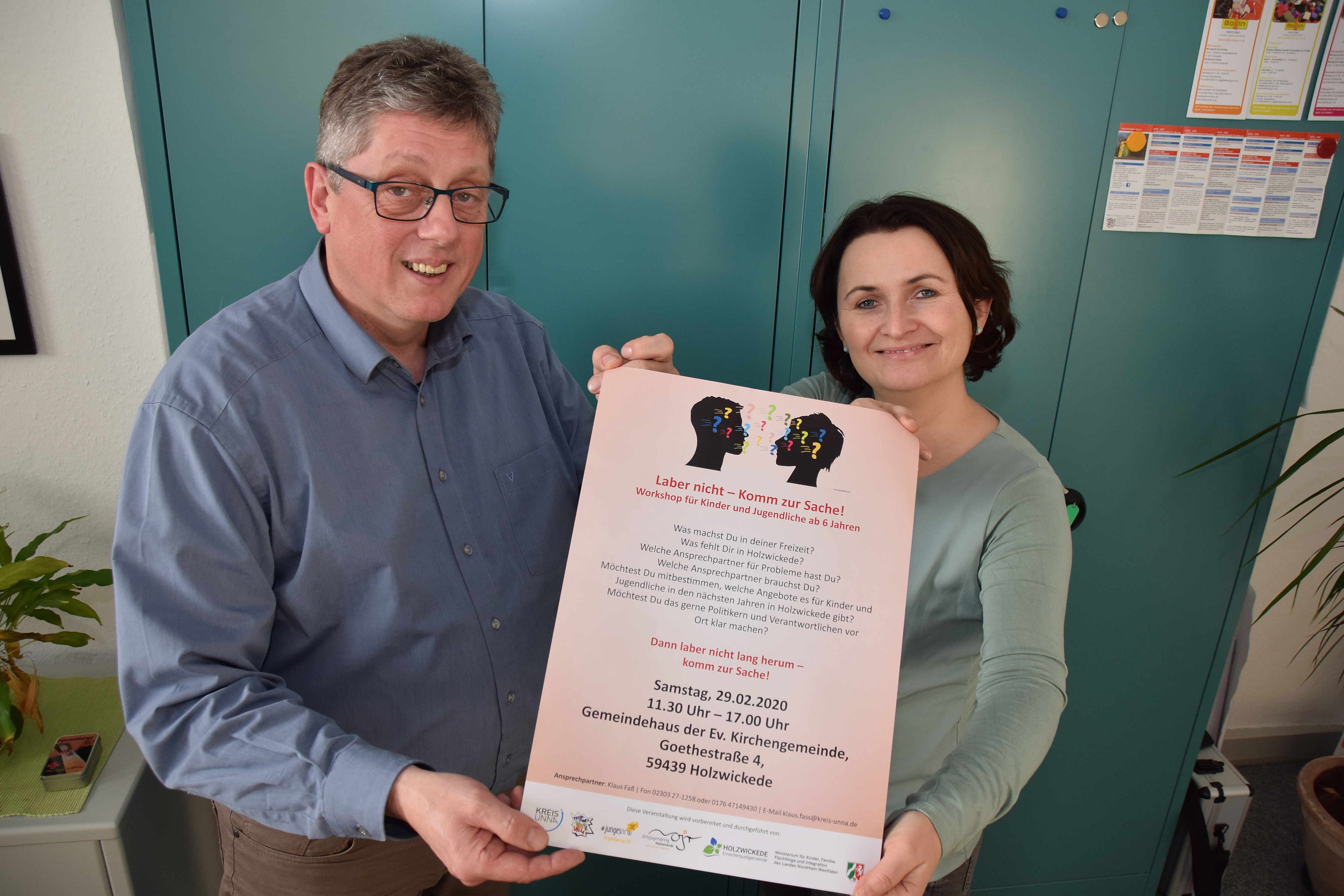 Bildzeile: Fachbereichsleiterin Katja Schuon und Kreisjugendpfleger Klaus Faß laden alle Kinder und Jugendlichen aus Holzwickede für Samstag, 29. Februar ab 11.30 Uhr in das Gemeindehaus der Evangelischen Kirchengemeinde ein. Foto: Birgit Kalle – Kreis Unna