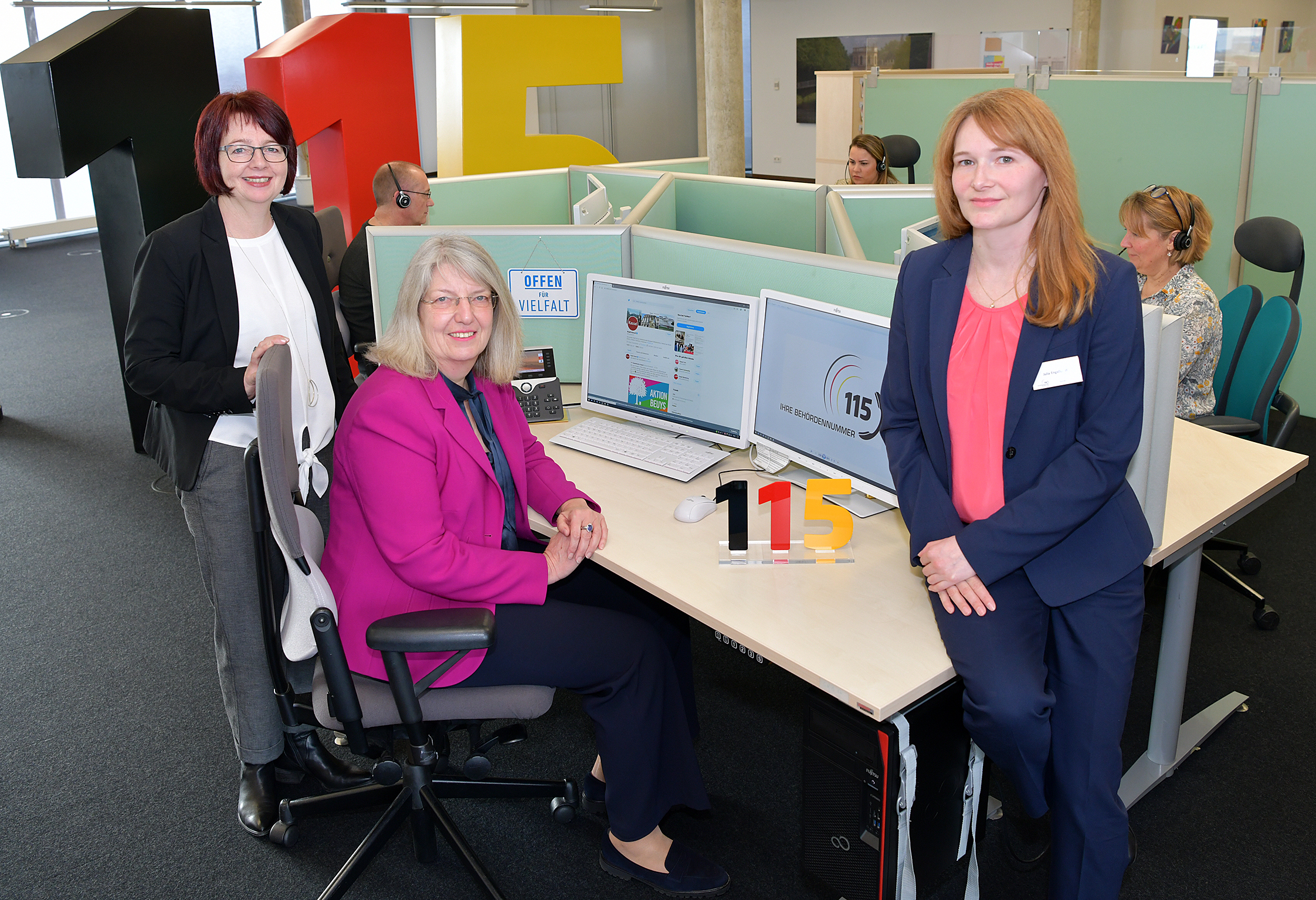 10 Jahre Servicecenter: Bürgermeisterin Ilona Friedrich (Mitte) mit Anja Morell (links, Leiterin des Bürgeramts) und Julia Engelhardt (rechts, Leiterin des Servicecenters). Foto: Stadt Kassel/Harry Soremski