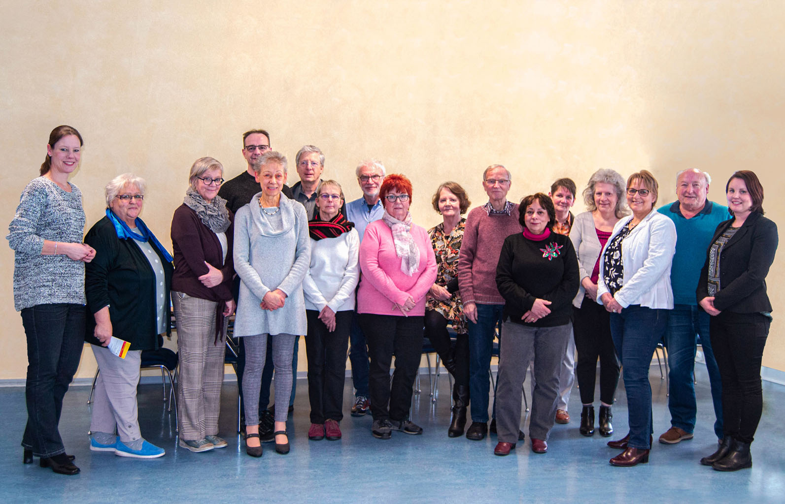 Die drei hauptamtlichen Continue-Ansprechpartnerinnen Nicole Behlau (l.), Dörte Lauterbach (3. v.l.) und Anna-Lena Wolfsheimer (r.) und die Gruppensprecherinnen und Gruppensprecher müssen aufgrund der Corona-Pandemie ihre Mitte Februar besprochen Pläne für 2020 zurückfahren. Die Ehrenamtlichen auf dem Foto v.l.n.r.: Inge Schrader, Mirko Verkühlen, Birgit Vogel, Norbert Humberg, Anneliese Schön, Peter Postel, Evelyn Oderbein, Elisabeth Szkudlapski, Dietmar Halbeisen, Germaine Bödingmeier, Inge Jeschak, Jutta Menzel Kasimir, Silke Bald und Friedhelm Leppert.
