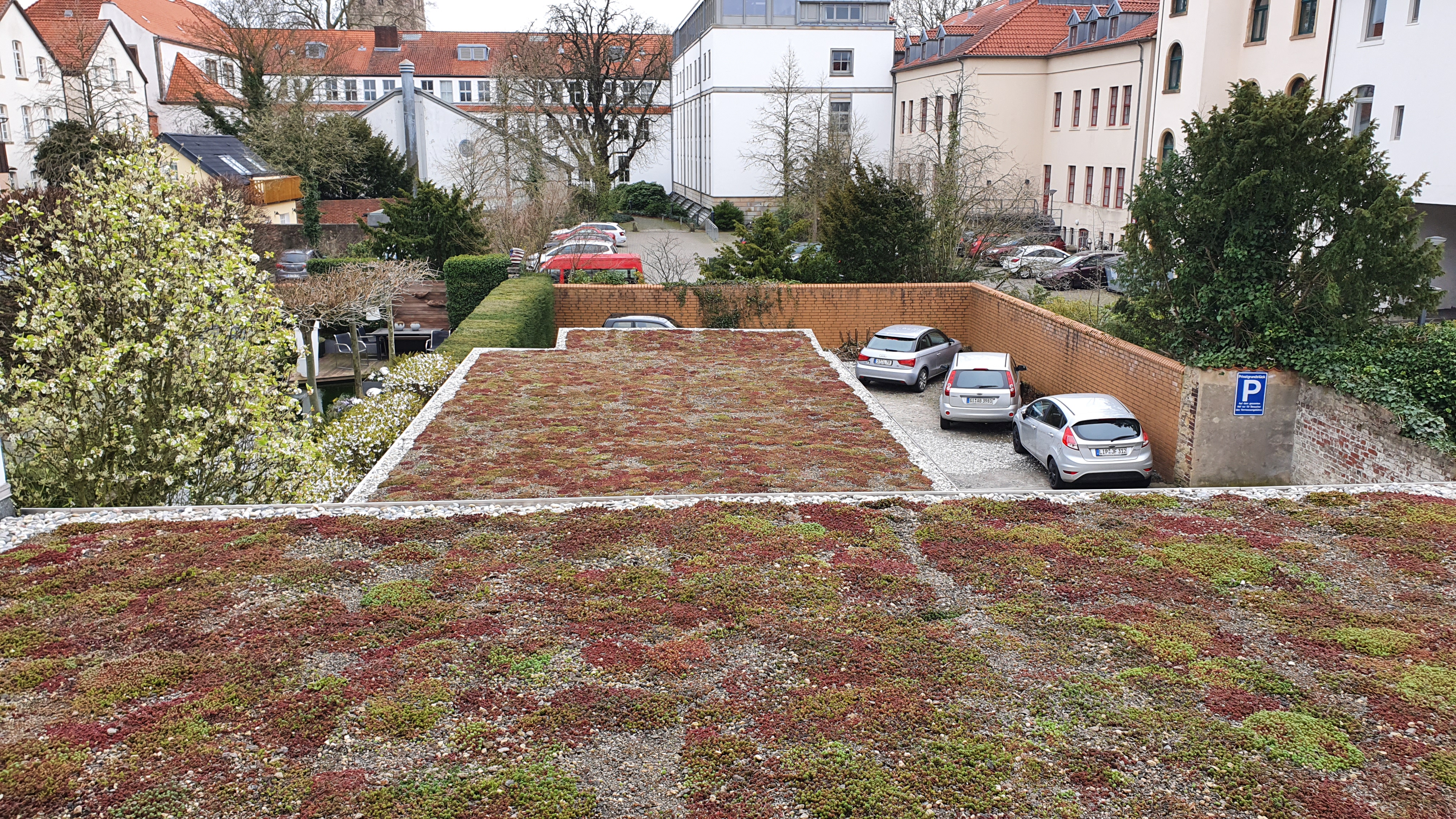 Wer das Dach seines Hauses begrünt, kann dafür von der Stadt eine Förderung erhalten. Das Foto zeigt das in 2019 mit Förderung hergestellte Gründach des Unternehmens Vermessungsingenieure Flüssmeyer.