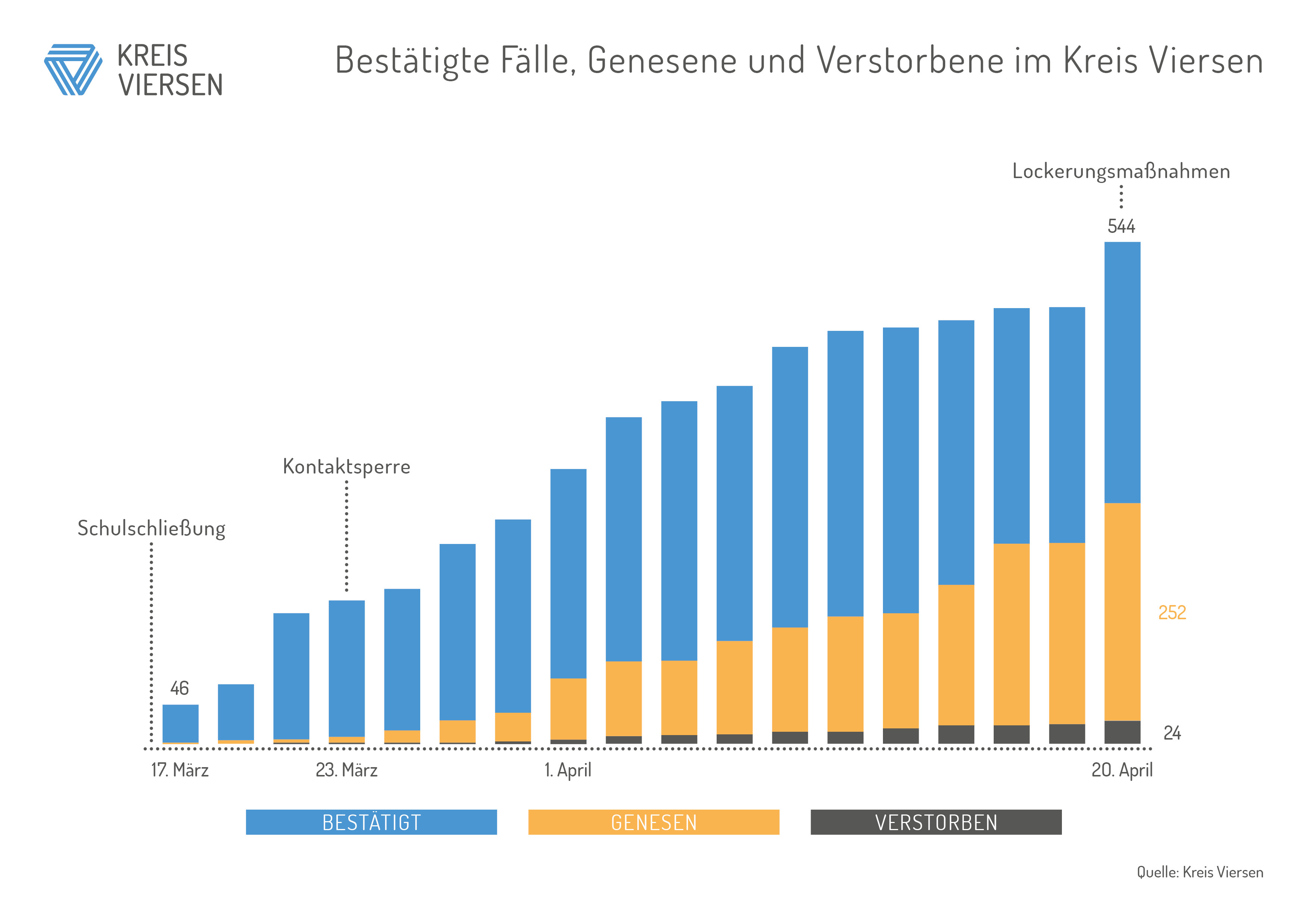 Bestätigte Fälle, Genesene und Verstorbene im Kreis Viersen bis zu den Lockerungsmaßnahmen von Bund und Ländern am 20. April