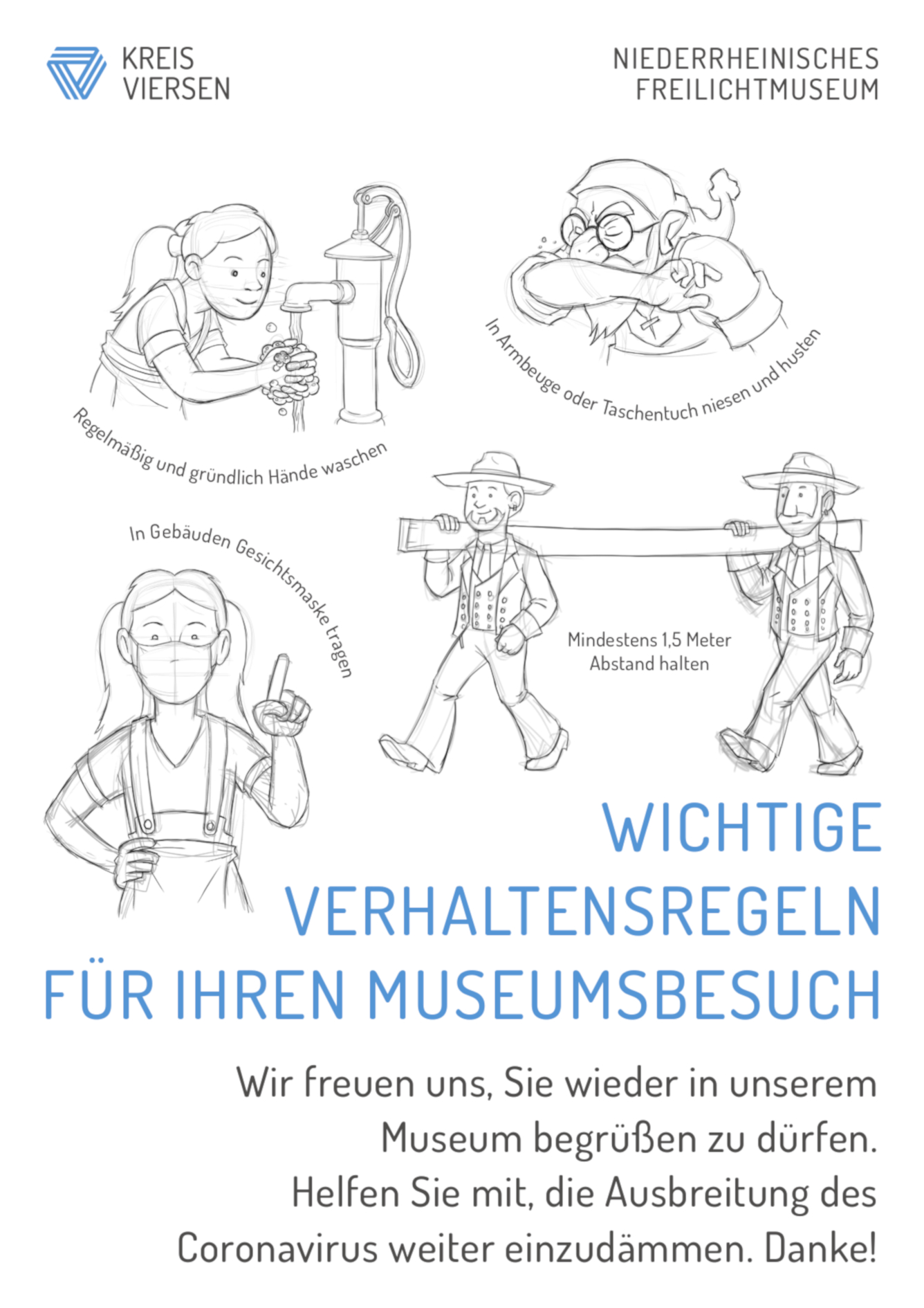 Die beliebten illustrierten Figuren aus dem museumspädagogischen Programm erklären den Besuchern die Hygienerichtlinien. Grafik: Kreis Viersen