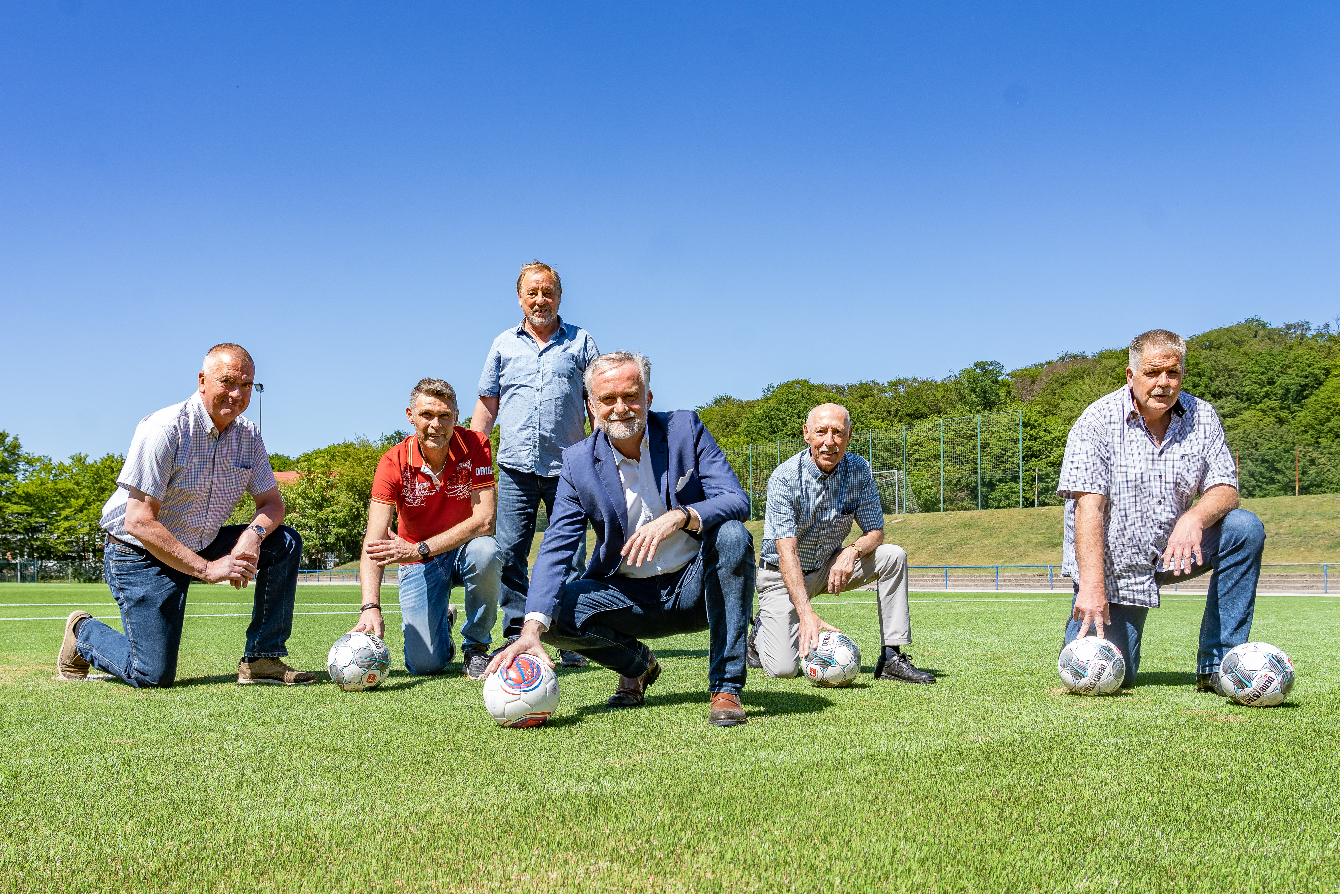 Sie leisten ihren Beitrag dazu, das Osnabrück eine Sportstadt ist: (von links) Christian Deppen (Planungsbüro Brinkmann + Deppen), Jörg Schirmbeck (Stadt Osnabrück), Burckhard Ahlers (TuS Nahne), Oberbürgermeister Wolfgang Griesert sowie Werner Tegeler und Detlef Wippich (beide TuS Nahne).