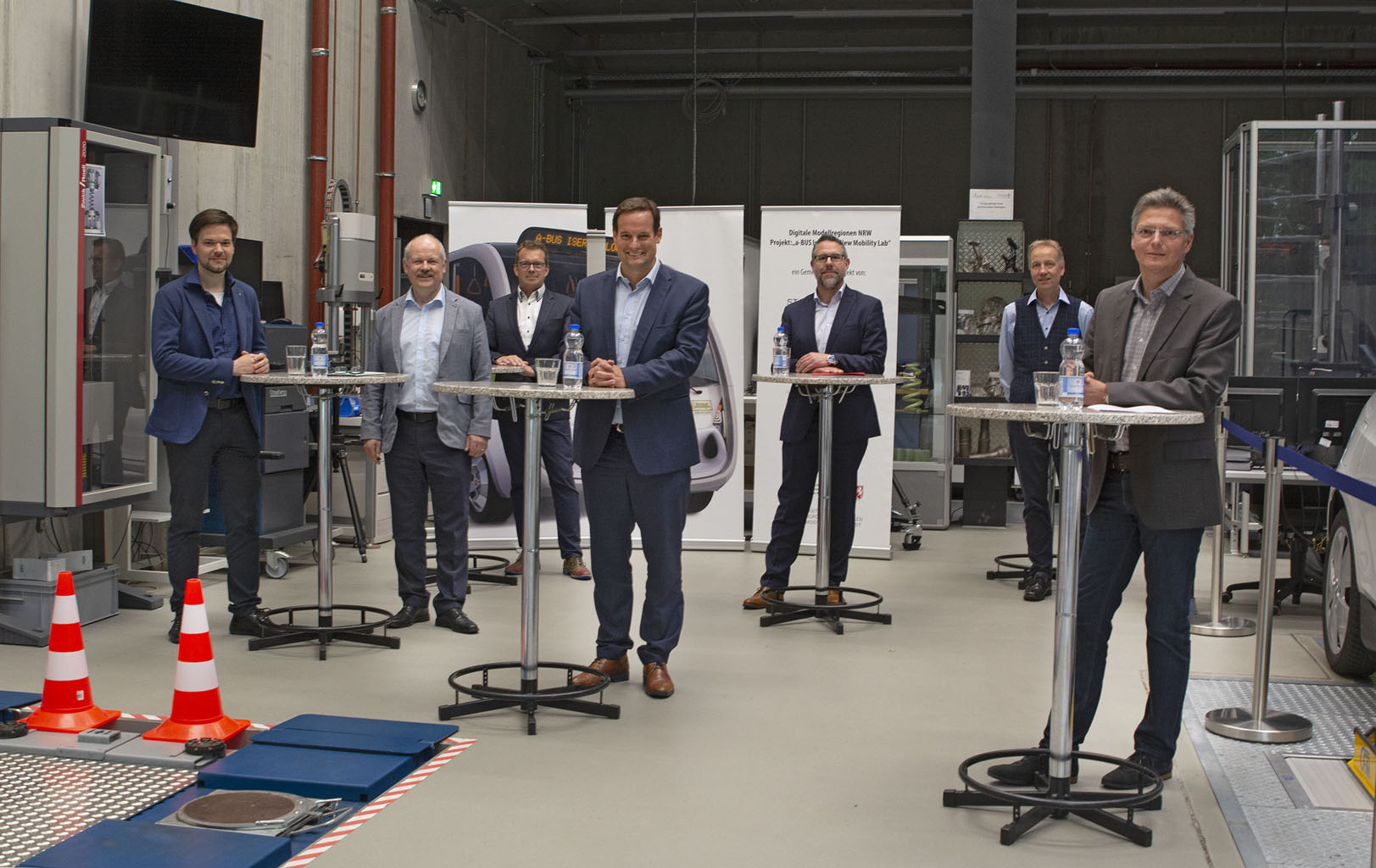 Erläuterten das weitere Vorgehen beim Projekt „a-BUS Iserlohn – New Mobility Lab“ (v.l.) Manuel Weniger, Christian Eichhorn, Reiner Timmreck, Thorsten Schick, Stefan Janning sowie Prof. Dr.-Ing. Ulf Witkowksi und Prof. Dr.-Ing. Andreas Nevoigt.