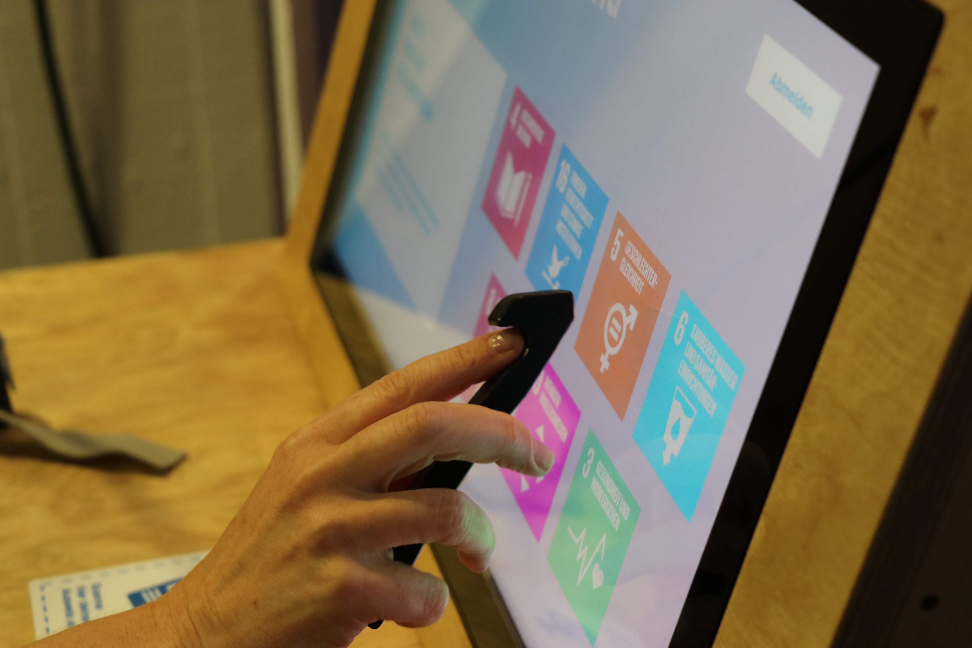 Mit dem Pen-Y, einem sicheren Eingabestift, werden die Touchscreens der Erlebnisaus-stellung „Mission 2030“ im Museum am Schölerberg kontaktfrei bedient.