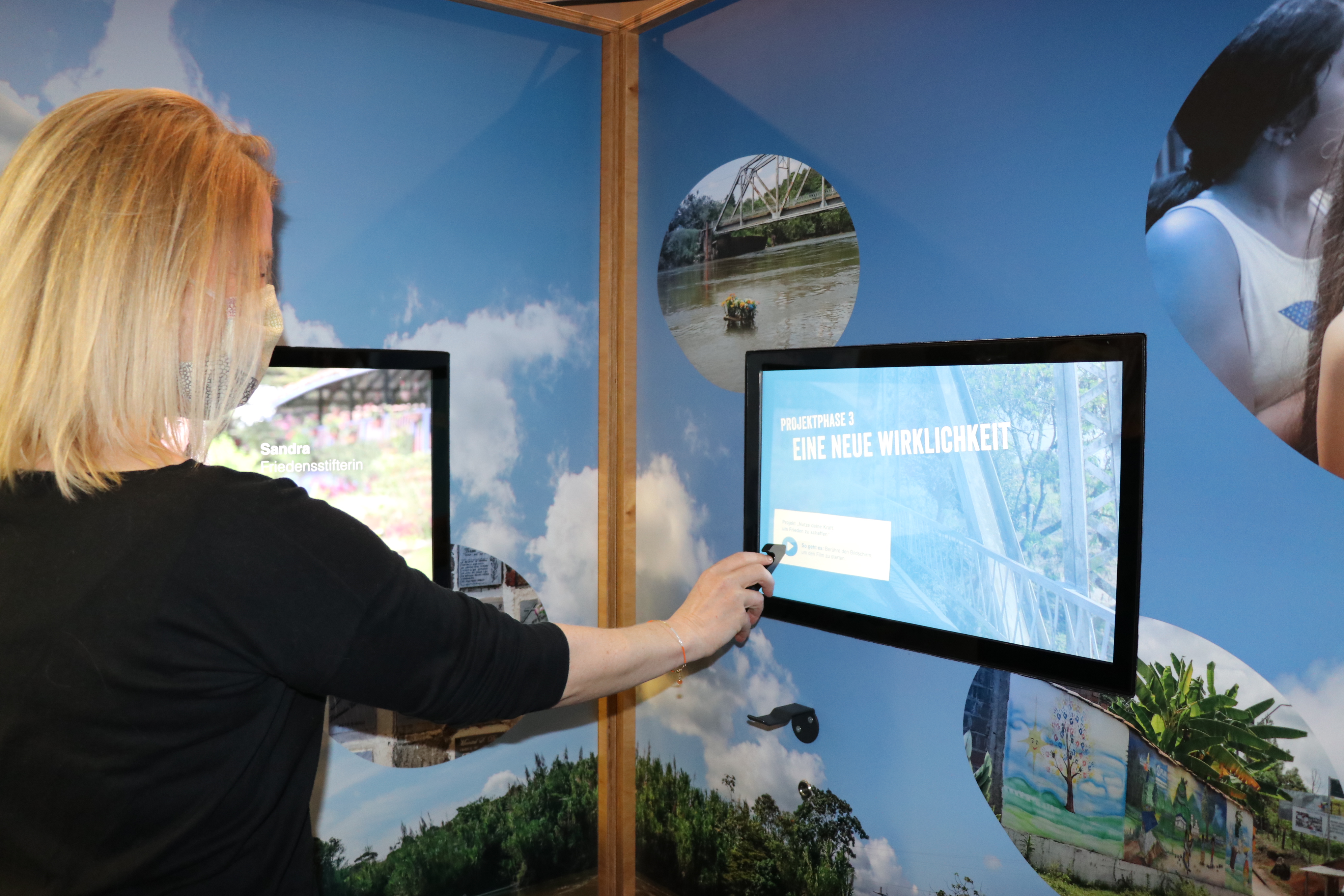 Mit dem Pen-Y, einem sicheren Eingabestift, werden die Touchscreens der Erlebnisaus-stellung „Mission 2030“ im Museum am Schölerberg kontaktfrei bedient.