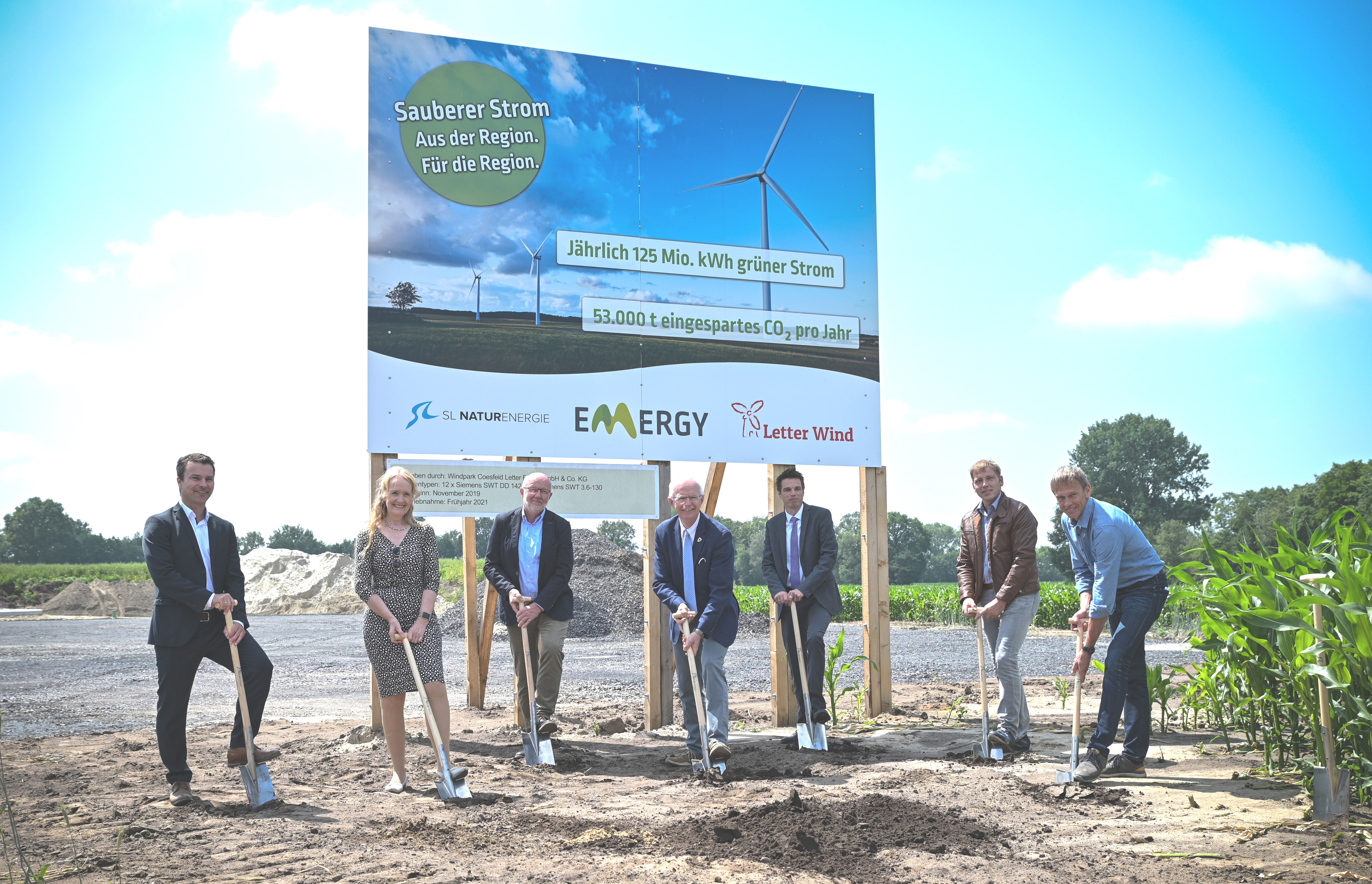 Setzen symbolisch den ersten Spatenstich für einen der größten Windparks Nordrheinwestfalens (v.l.n.r.): Marco Lange - Siemens Garmesa, Borkens Bürgermeisterin Mechtild Schulze Hessing, Coesfelds Bürgermeister Heinz Öhmann, der Geschäftsführer des Emergy Unternehmensverbunds Ron Keßeler, Letter Wind Geschäftsführer Johannes Peter und SL NaturEnergie-Geschäftsführer Klaus Schulze Langenhorst.