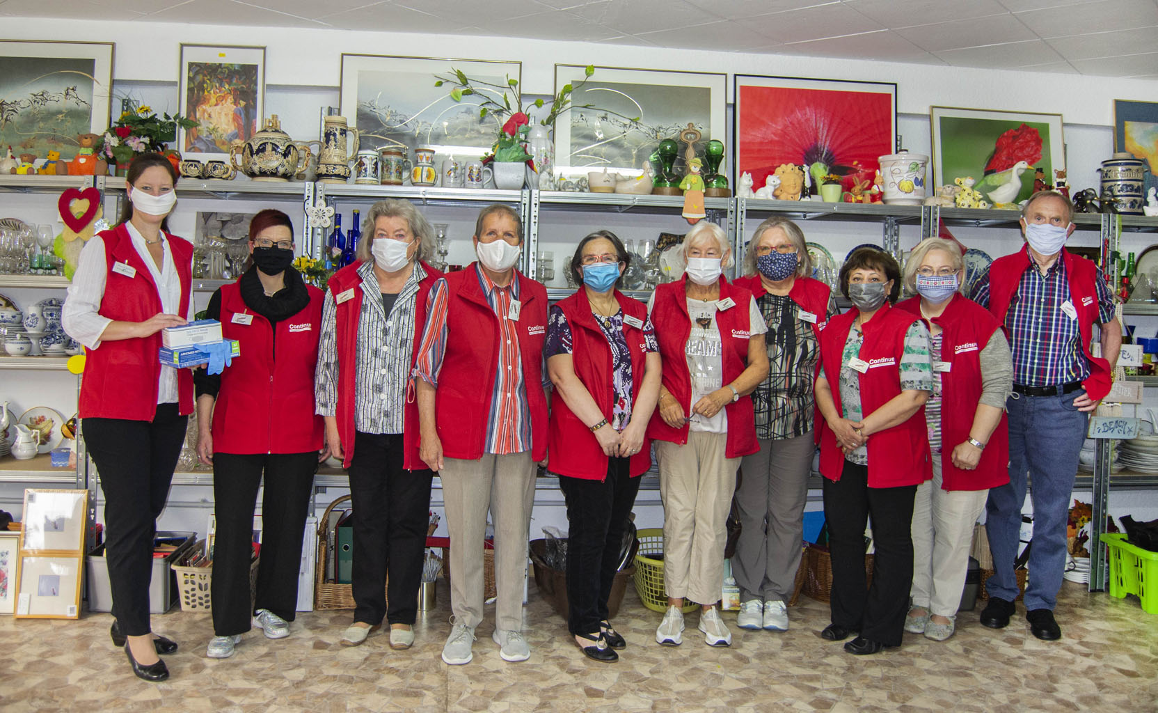 Freuen sich auf den Start des Ladens “Neue Brücke” nach der Corona-Pause (v.l.): Nicole Behlau, Diana Theiling, Anne Kowski, Waldtraud Marquardt, Margareta Krauss, Renate Kommorowski, Ellen Willers, Germaine Bödingmeier, Irmgard und Hans Rainer Finger.