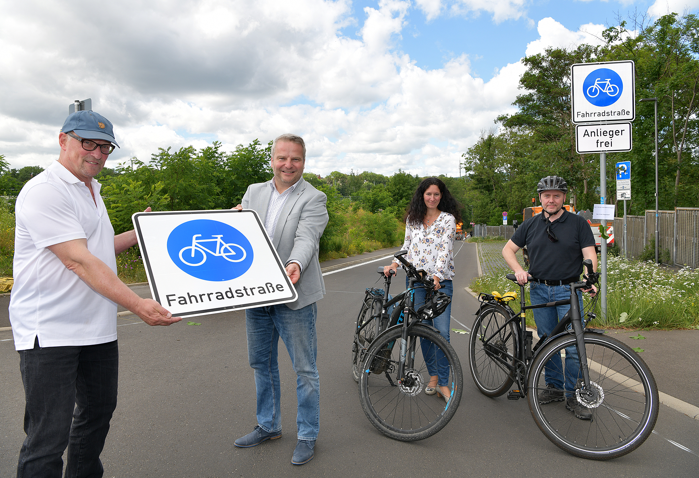 Hans Roth (von links, Ortsvorsteher Rothenditmold) und Dirk Stochla (Verkehrsdezernent) eröffnen mit Anne Grimm (Radverkehrsbeauftragte) und Dr. Georg Förster (Leiter Straßenverkehrs- und Tiefbauamt) die Fahrradstraße Schillerstraße. Foto: Stadt Kassel/Harry Soremski