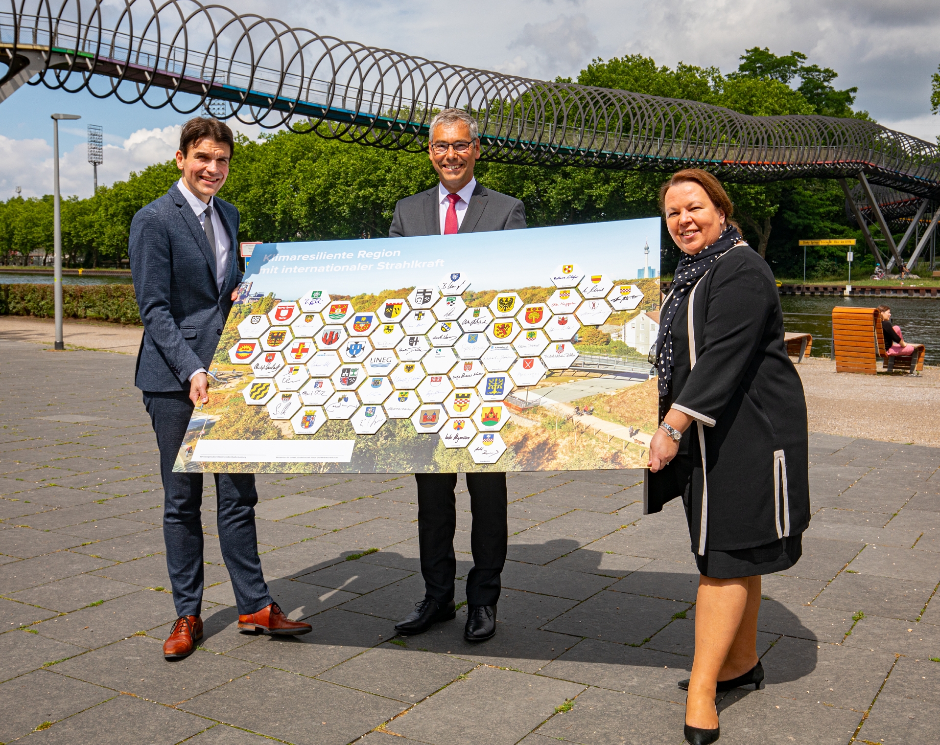 Prof. Dr. Uli Paetzel, Vorstandsvorsitzender von Emschergenossenschaft und Lippeverband, Prof. Dr.-Ing. Norbert Jardin, Vorstandsvorsitzender des Ruhrverbands und NRW-Umweltministerin Ursula Heinen-Esser (v.l.) bei der Unterzeichnung der symbolischen Erklärung zur "Klimaresilienten Region mit internationaler Strahlkraft" an der Brückenskulptur "Slinky Springs to Fame" in Oberhausen.