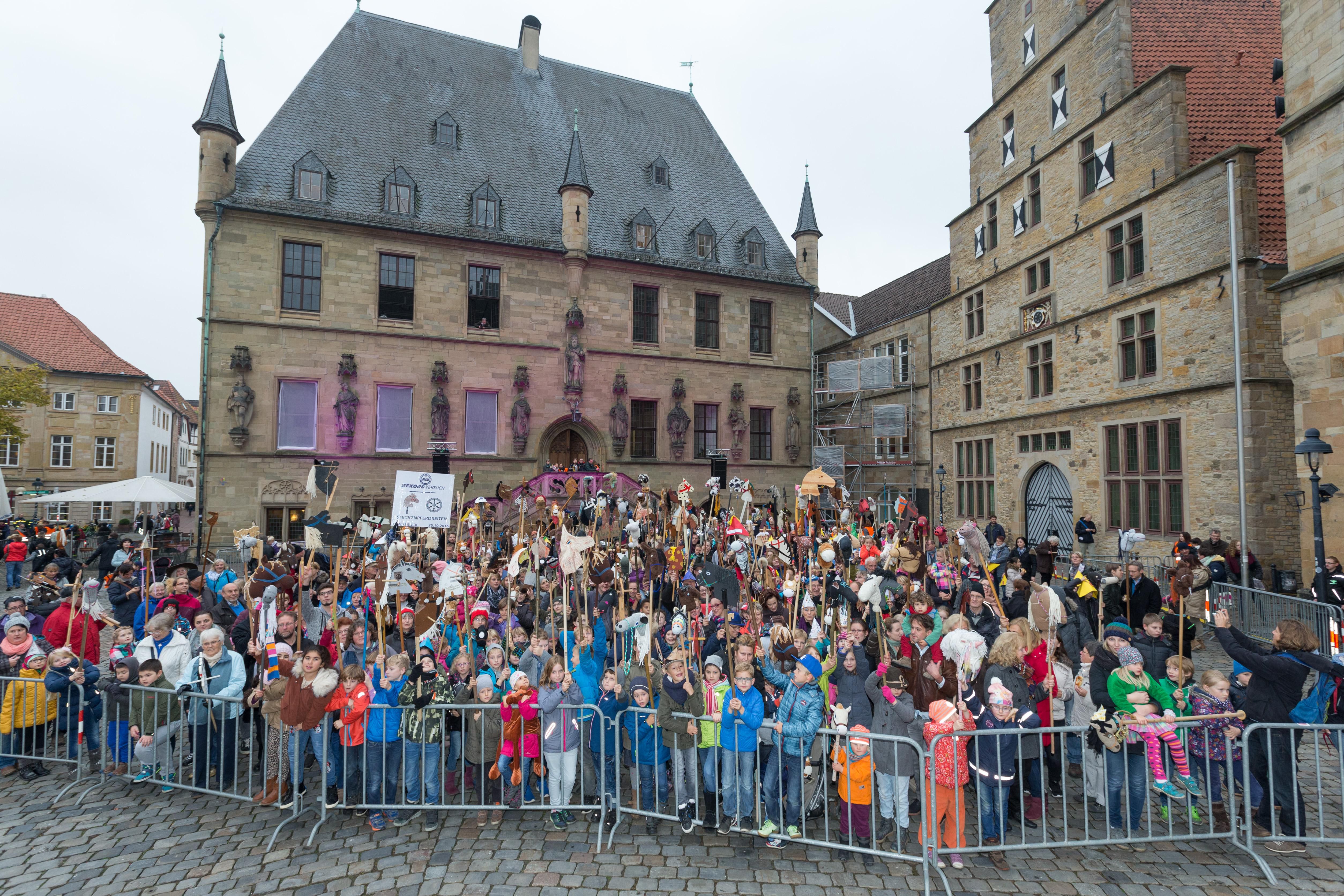 Das Steckenpferdreiten wird verschoben und soll voraussichtlich im kommenden Frühling stattfinden. Nach den aktuellen Corona-Auflagen für Großveranstaltungen gibt es zurzeit keine Lösung, nach der die Viertklässler aller Osnabrücker Grund- und Förderschulen über die Rathaustreppe reiten könnten. Foto: Archiv Stadt Osnabrück, Friso Gentsch