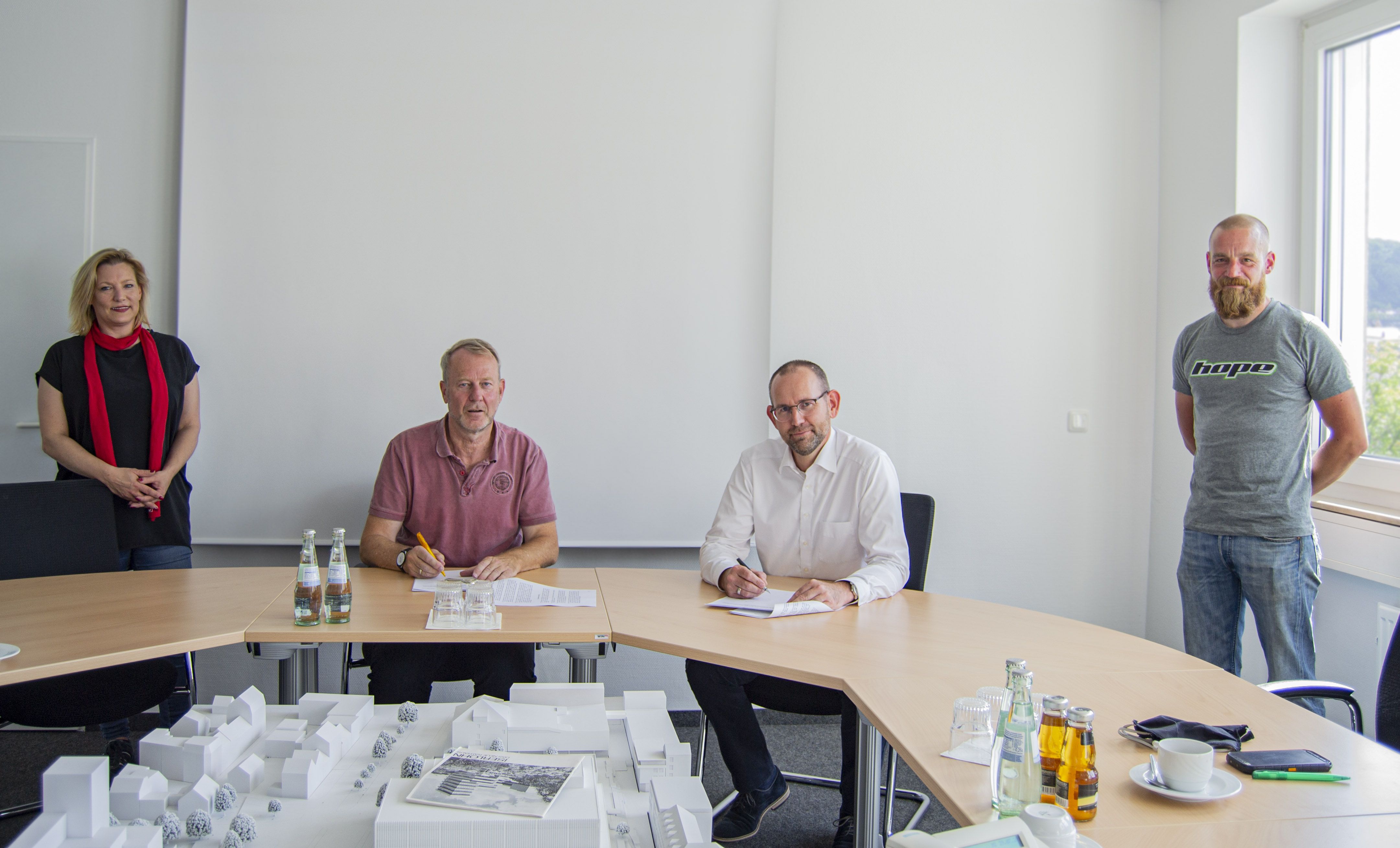Im Beisein der Sportausschuss-Vorsitzenden Sylvia Patscher und TuS-Abteilungsleiter Thilo Koesling (r.) unterzeichneten TuS-Vorsitzender Axel Kahl (3. v. r.) und Stadtbaurat Thorsten Grote den Vertrag für die „Eisenwald Trails“.