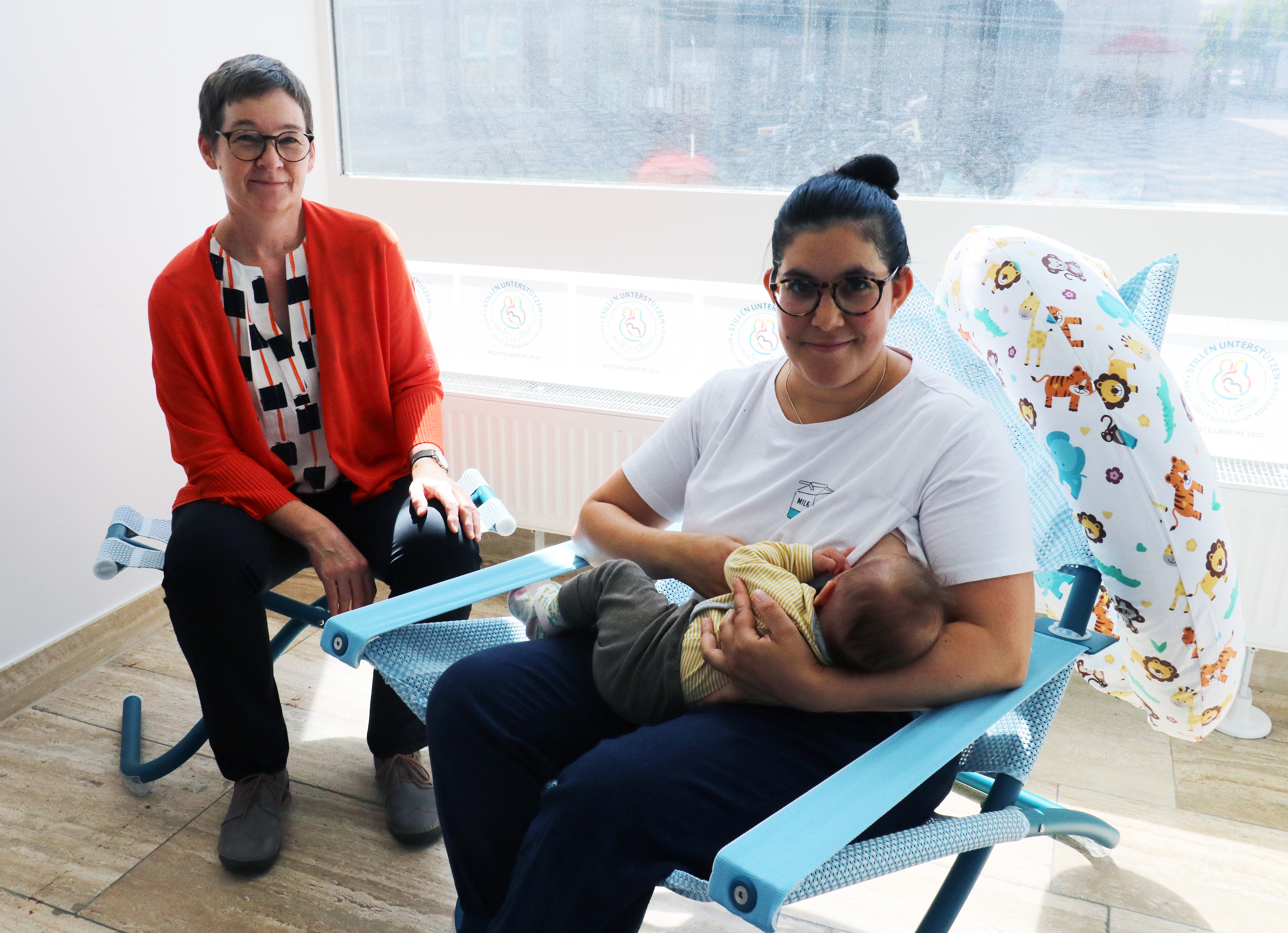 Jugenddezernentin Ulrike Gote weiht den blickdichten Stillraum im Foyer des Jugendamts am Scheidemannplatz ein. Erste Nutzerin ist Joana Al Samarraie mit ihrer vier Monate alten Tochter Amelie. Foto: Stadt Kassel/Constanze Wüstefeld