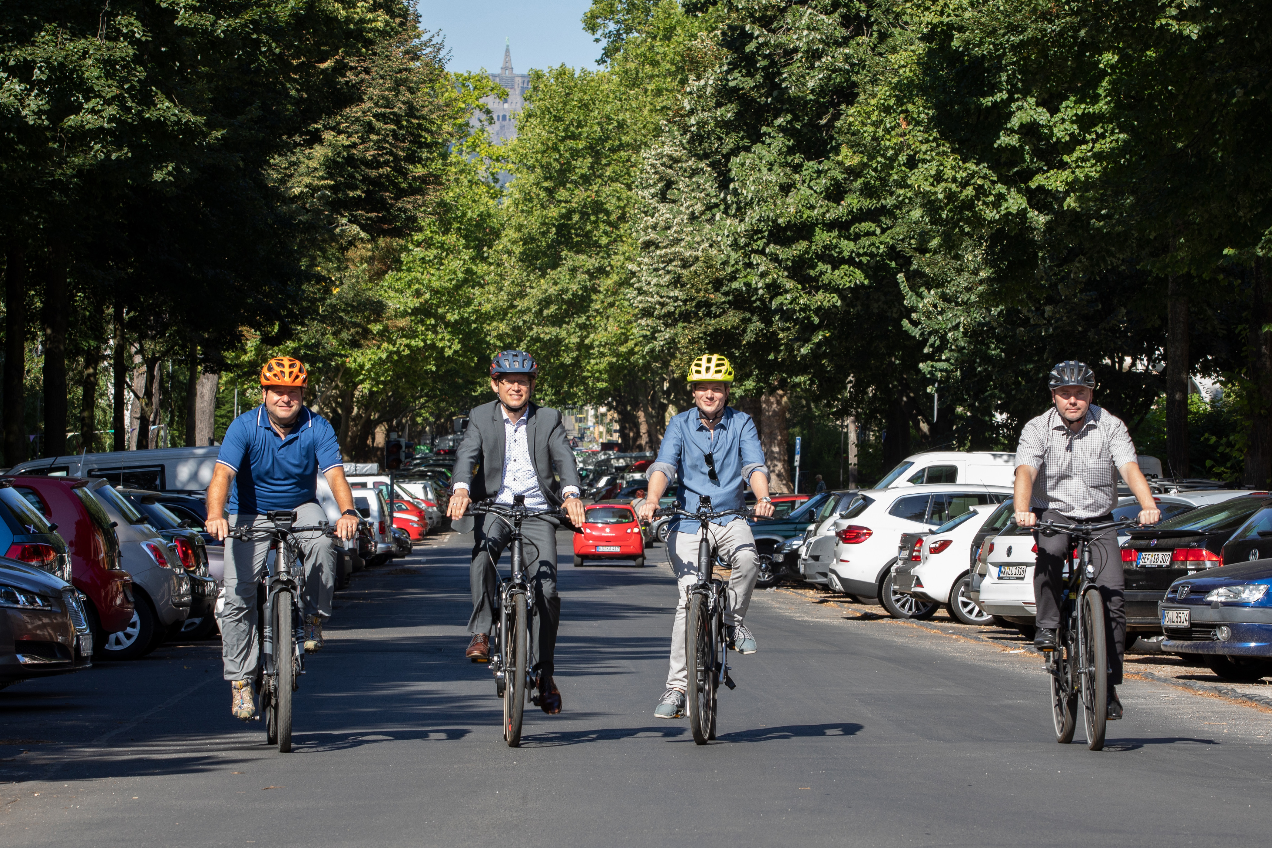 Kassels Verkehrsdezernent Dirk Stochla (von links), Staatssekretär Jens Deutschendorf, Steffen Müller (Ortsvorsteher Vorderer Westen) und Dr. Georg Förster (Leiter Straßenverkehrs- und Tiefbauamt der Stadt Kassel) fahren über die Goethestraße, die bald Fahrradstraße wird.