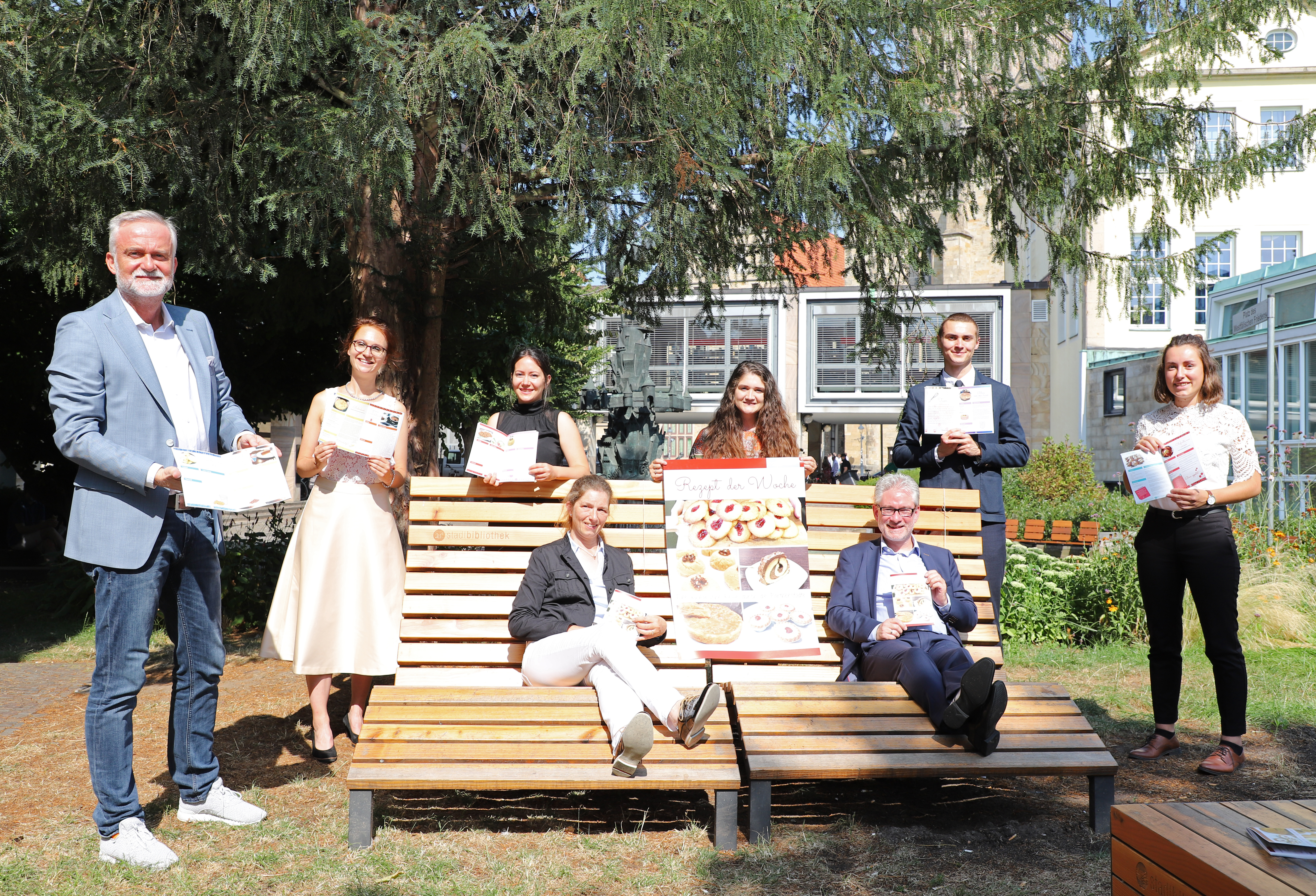 Ihre Lieblingsrezepte aus dem neuen Kochbuch präsentieren (stehen v.l.) Oberbürgermeister Wolfgang Griesert, Janna Kamphof, Neşe Yıldız Kendibaşına, Emily Staton, Sergey Loginov und Nolwenn Ricou zusammen mit (sitzend) Claudia Ruschmeier und Jens Koopmann vom Osnabrücker Städtepartnerschaftsbüro.