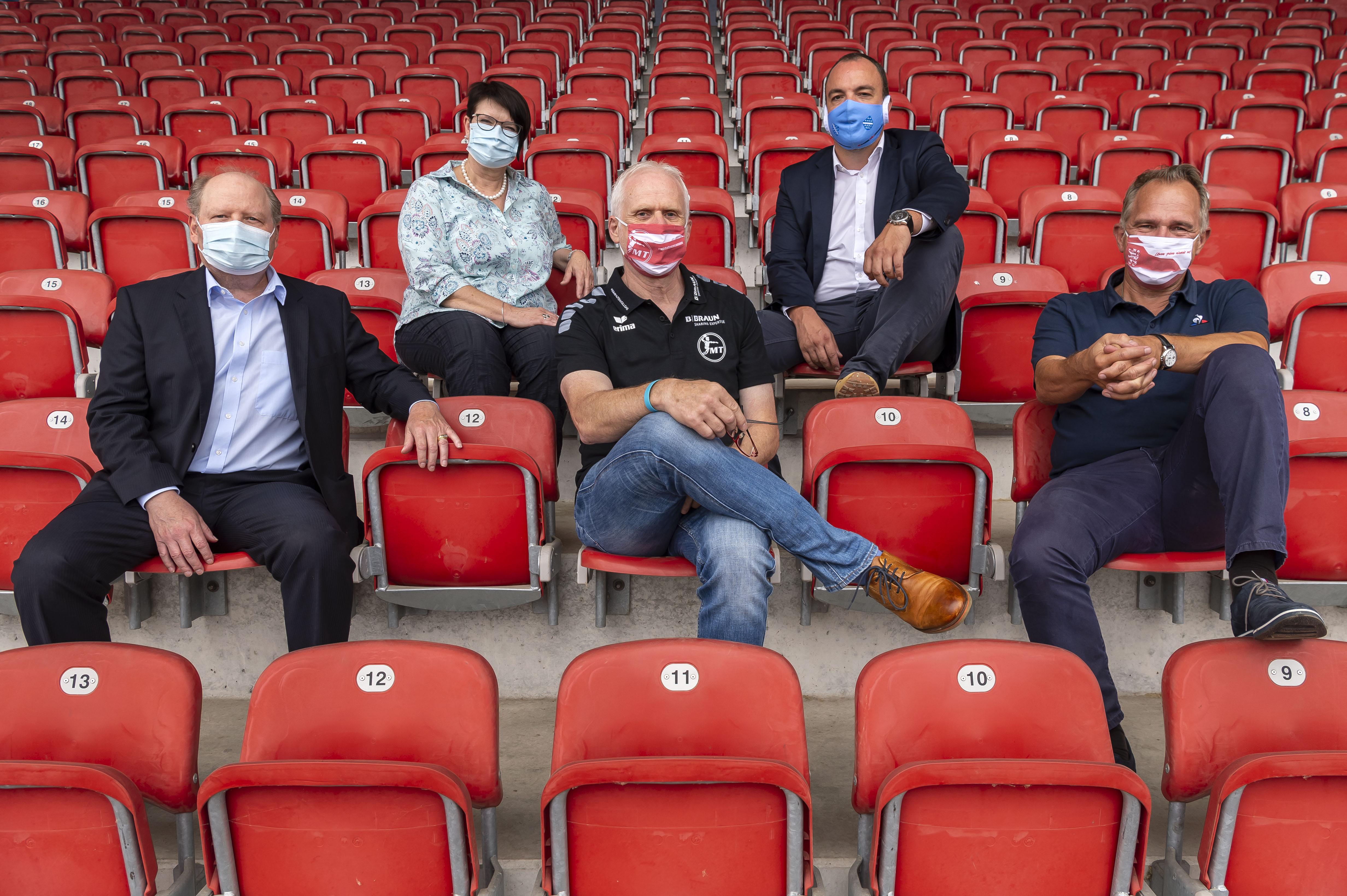 Mit Mund-Nasen-Bedeckung auf der Tribüne: Joe Gibbs (Geschäftsführer EC Kassel Huskies, vorne von links), Bernd Kaiser (Pressesprecher MT Melsungen), Jens Rose (Vorstandssprecher KSV Hessen Kassel), Regine Bresler (Leiterin Gesundheitsamt Region Kassel, hinten von links) und Oberbürgermeister Christian Geselle stellten vor, wie Spitzensport in Zeiten der Corona-Pandemie laufen kann. Foto: Stadt Kassel/Bernd Schoelzchen