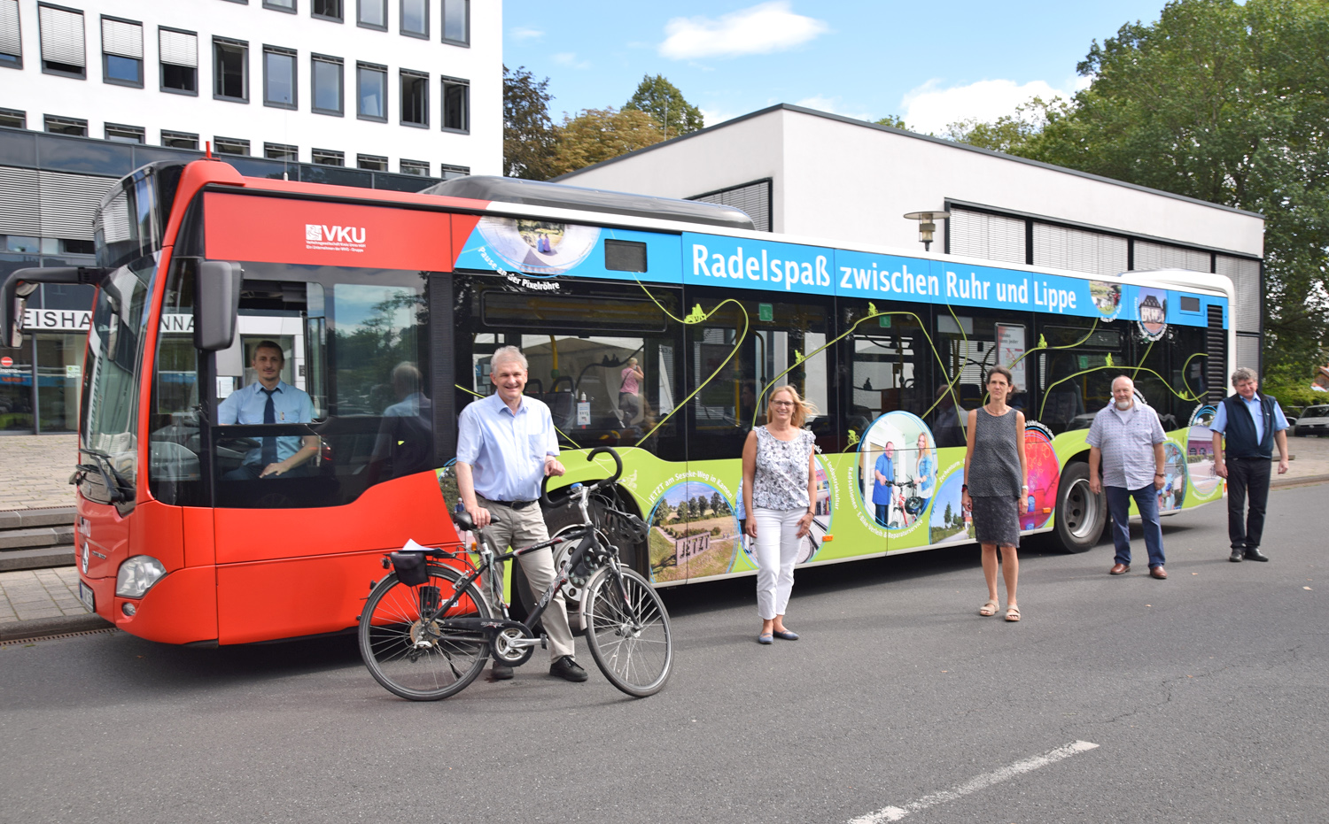 Bildzeile: Landrat Michael Makiolla (l.) stellte mit Sabine Leiße (Leiterin Stabsstelle Planung und Mobilität, 3.v.l.) und weiteren Projektpartnern die Buswerbung vor. Foto: Max Rolke – Kreis Unna