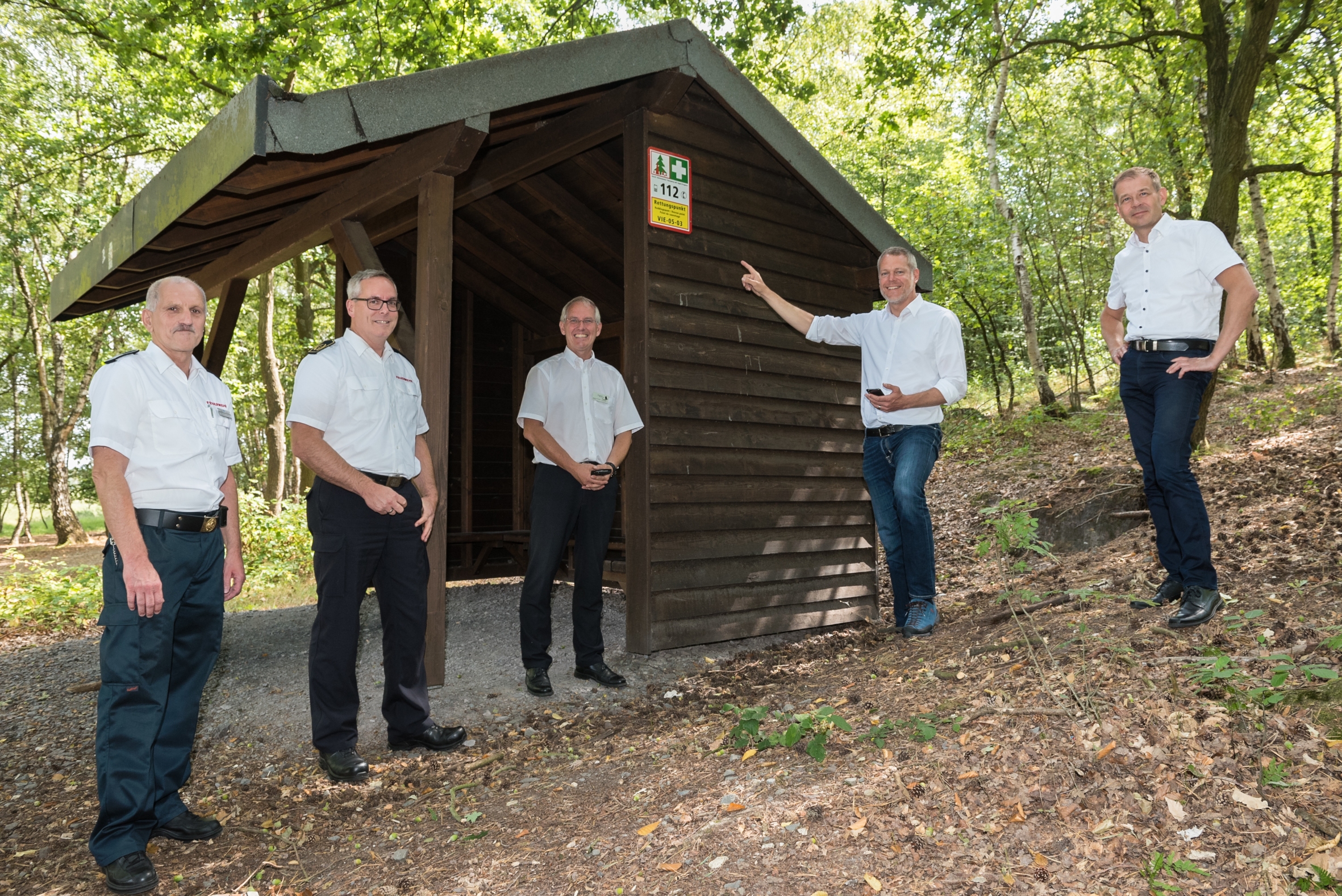 V.l.n.r.: Heinz-Georg Lenssen, Leiter der Kreisleitstelle, Rainer Höckels, Kreisbrandmeister und Leiter des Amts für Bevölkerungsschutz, Michael Puschmann, Geschäftsführer des Naturparks Schwalm-Nette, Landrat Dr. Andreas Coenen und Andreas Budde, Dezernent für Planen, Bauen und Umwelt, besichtigten einen Rettungspunkt an einer Schutzhütte in Niederkrüchten.