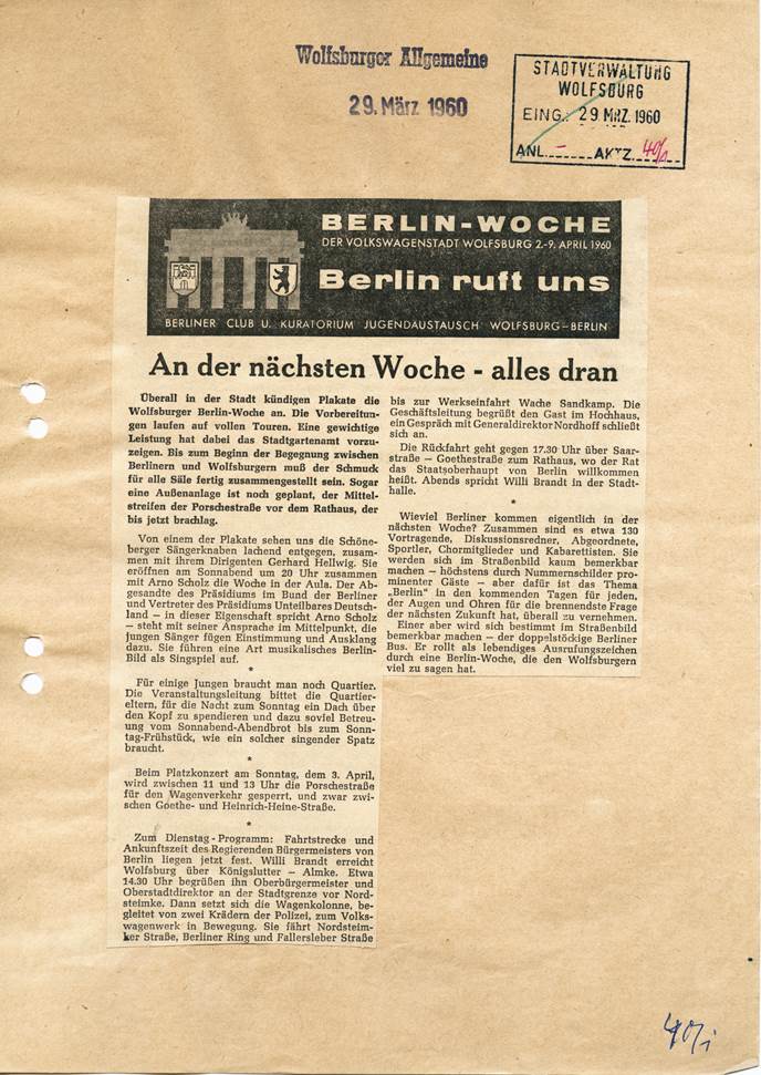 Bildnachweis: StadtA WOB, HA 2781, Ankündigung der Berlin-Woche in der Wolfsburger Allgemeinen Zeitung vom 29. März 1960