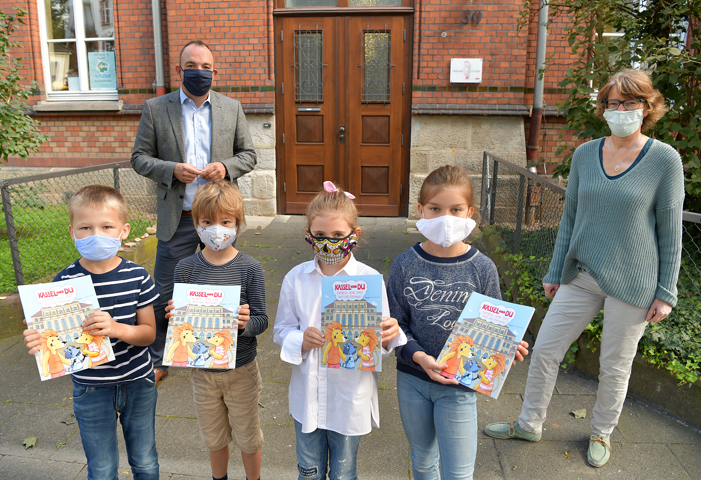 „Kassel und Du – Entdecke Deine Stadt und das Rathaus“: Stellvertretend für alle Grundschulen in Kassel hat Oberbürgermeister Christian Geselle die Herkulesschule beliefert und die Exemplare des Mitmach- und Entdeckerhefts übergeben an Maximilian Rubner (vorne von links), Piet Niemzik, Alexis Buk-Heyne, Lavinia Schneider und Schulleiterin Marion Völker. Hinweis: Da die Kinder alle in eine Klasse gehen, brauchen die Abstände nicht eingehalten werden.