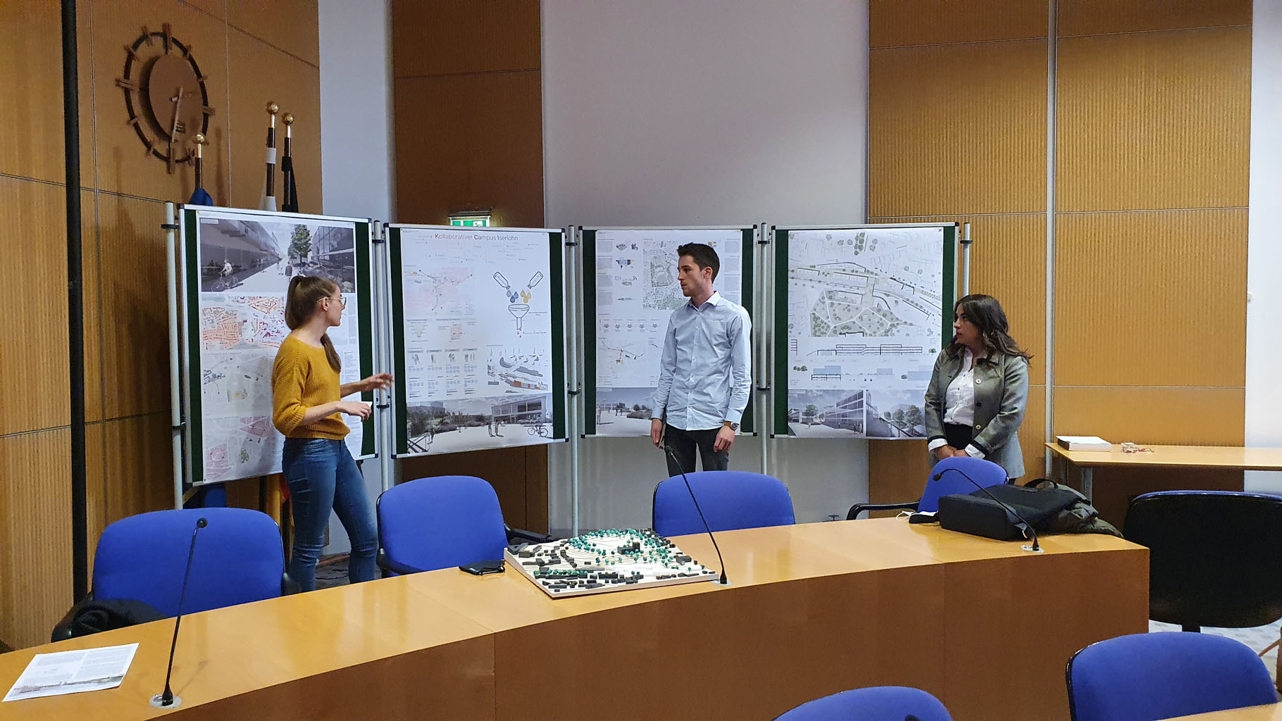 Die Studierenden Saskia Berger, Jonas Schmidt und Sara Mulleri (v.l.) präsentieren den Siegerentwurf „Kollaborativer Campus Iserlohn“ im Rahmen des studentischen städtebaulichen Wettbewerbs „Digitaler Wissencampus Iserlohn“.