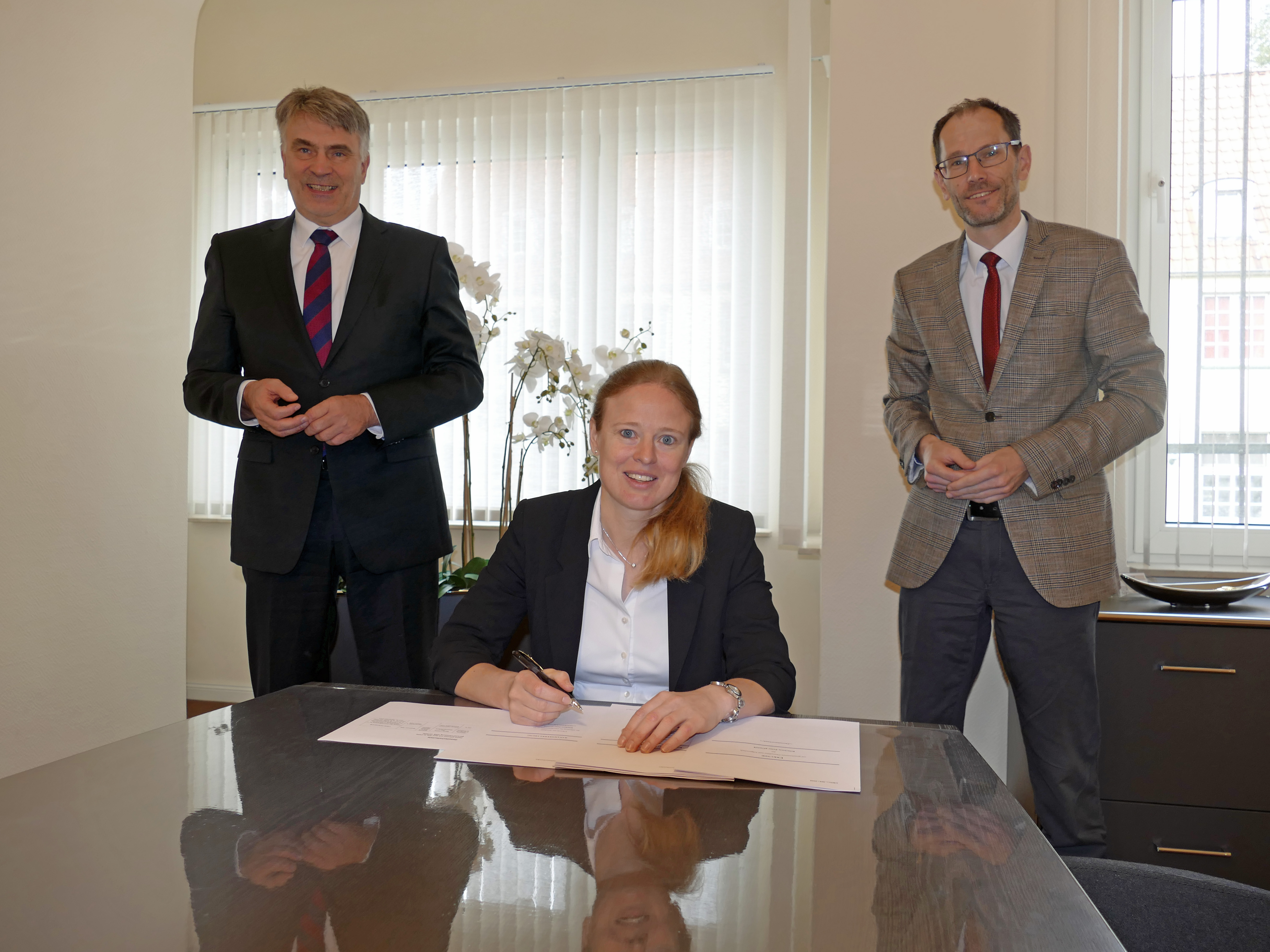 Erster Kreisrat Henning Heiß (links) und Stadtrat Christian Axmann haben am Freitag den Vertrag zur Anteilsübereignung und den Konsortialvertrag für das Klinikum Peine unter notarieller Aufsicht von Ina Munzel unterzeichnet.