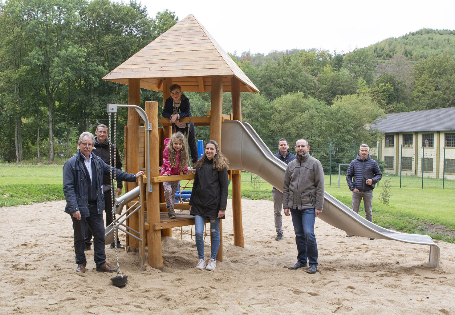 Vertreter der Stadt Iserlohn gaben im Beisein von Spielplatzpatin Melanie Graß und ihren Kindern sowie Vertretern des Sponsors Feinstahl Bender und der zuständigen Baufirma den neuen Spielpunkt am Leckeweg offiziell frei.