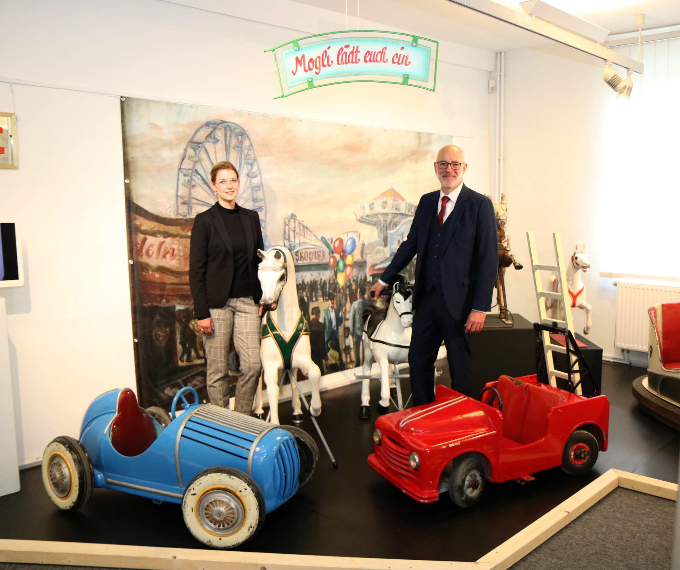 Anke Petrat, Leiterin des Freilichtmuseums und Kuratorin der Sonderausstellung, gibt gemeinsam mit Ingo Schabrich, Kreisdirektor und Kulturdezernent, eine Einführung in die neue Sonderausstellung des Niederrheinischen Freilichtmuseums "Die Kirmes kommt - Zur Geschichte des Jahrmarktes"