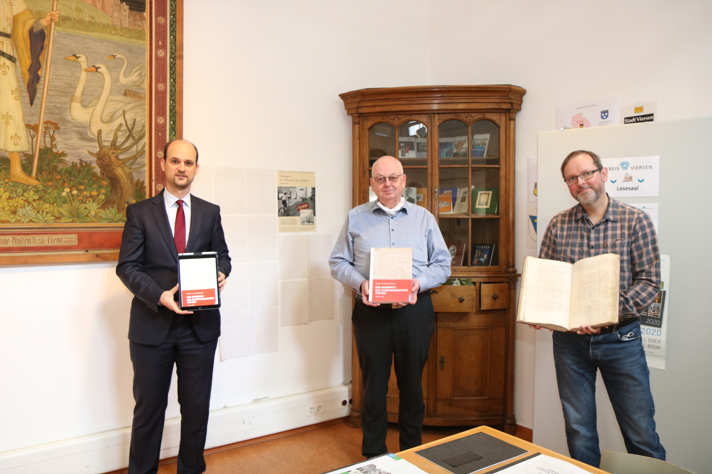 V.l.n.r.: Kreisarchivar Dr. Michael Habersack und Autor Herbert J.K. Söthe präsentieren die Abschrift des Bannbuches. Der frühere Stadtarchivar und Kreisarchivamtmann, Marcus Ewers, hält die restaurierte Originalquelle.