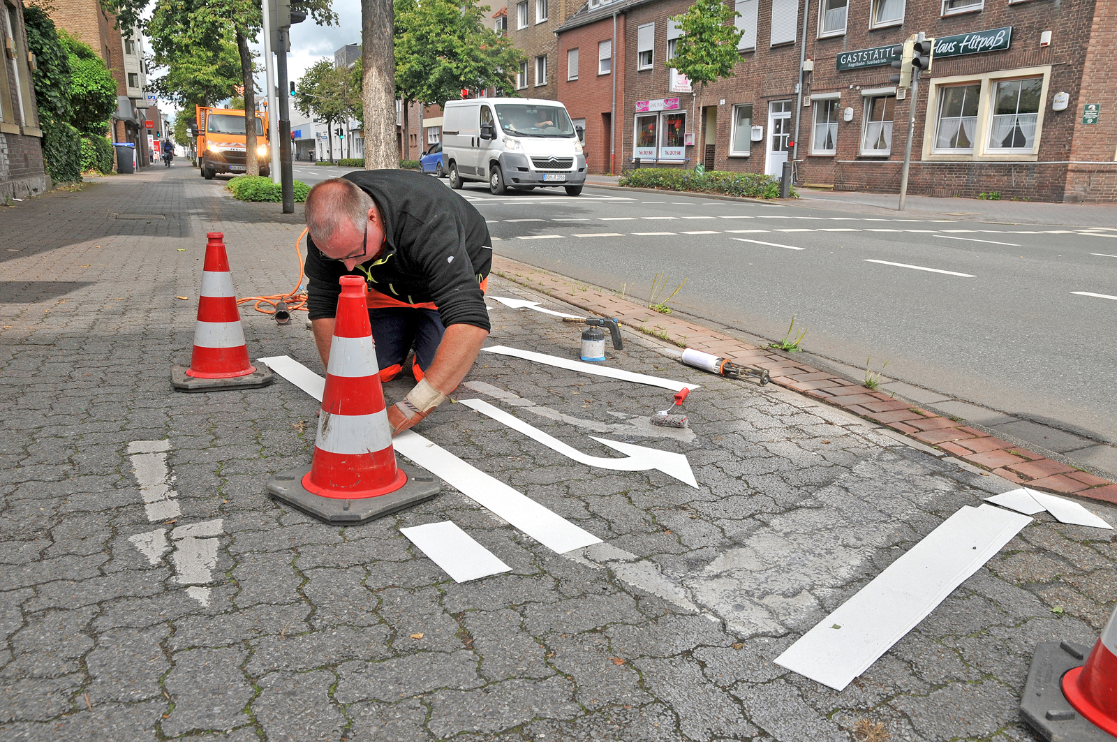 In regelmäßigen Abständen müssen abgenutzte Markierungen im Stadtgebiet erneuert werden. Martin Mölder ist einer der Experten der Straßenunterhaltung für diese spezielle Aufgabe.