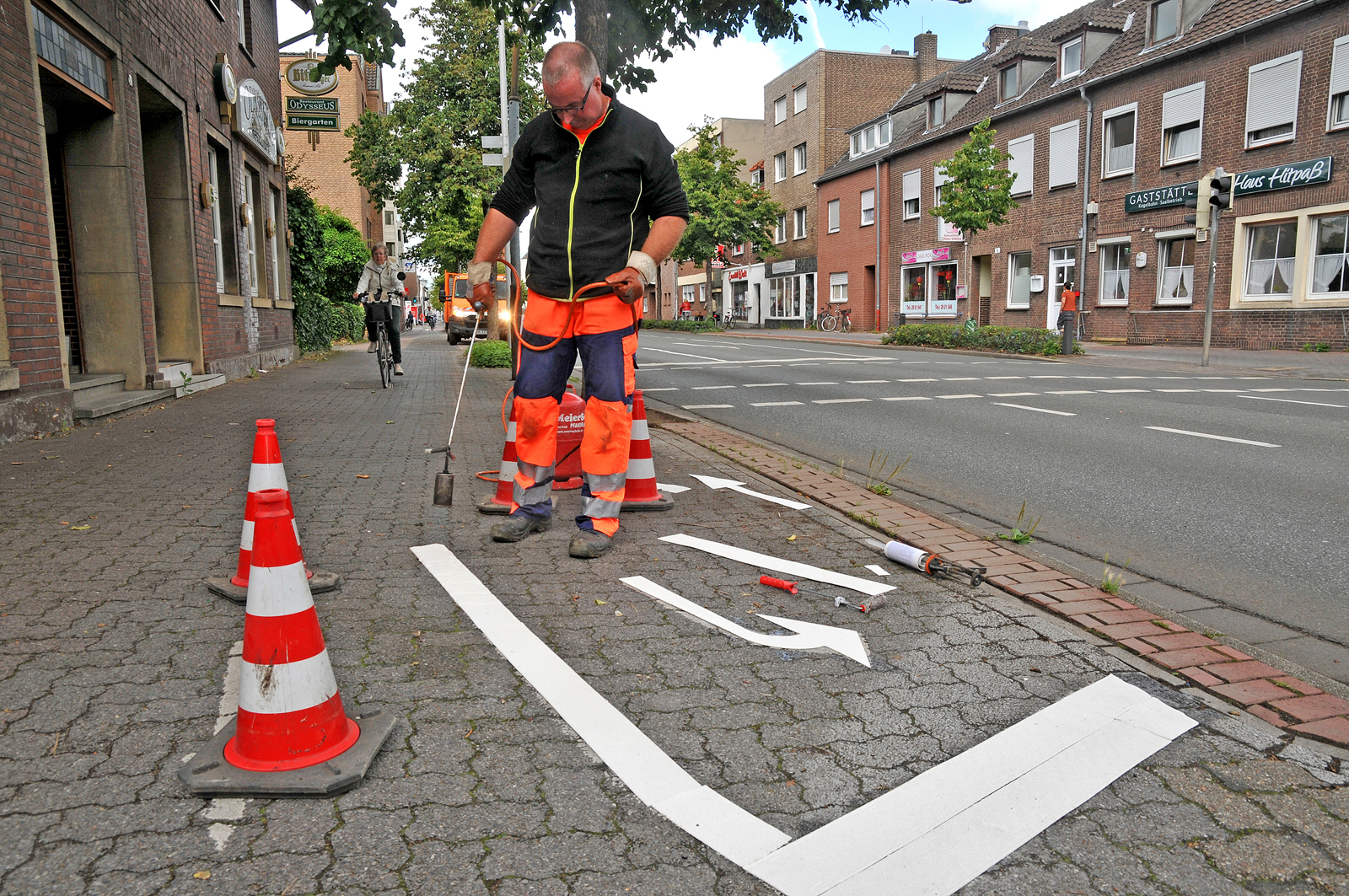 Nach dem Auflegen erhitzt Martin Mölder die neue Markierung mit einem Gasbrenner um sie so dauerhaft auf der Verkehrsfläche zu fixieren.