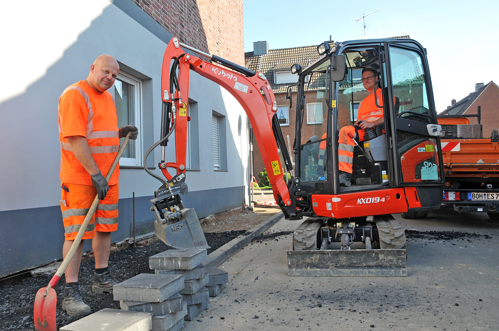Die Beseitigung von Gefahrenstellen im öffentlichen Bereich gehört u.a. zu den Aufgaben der Straßenunterhaltung. Manfred Terörde (von links) und Oliver Visser bei der Reparatur von Schäden an einem Gehweg.