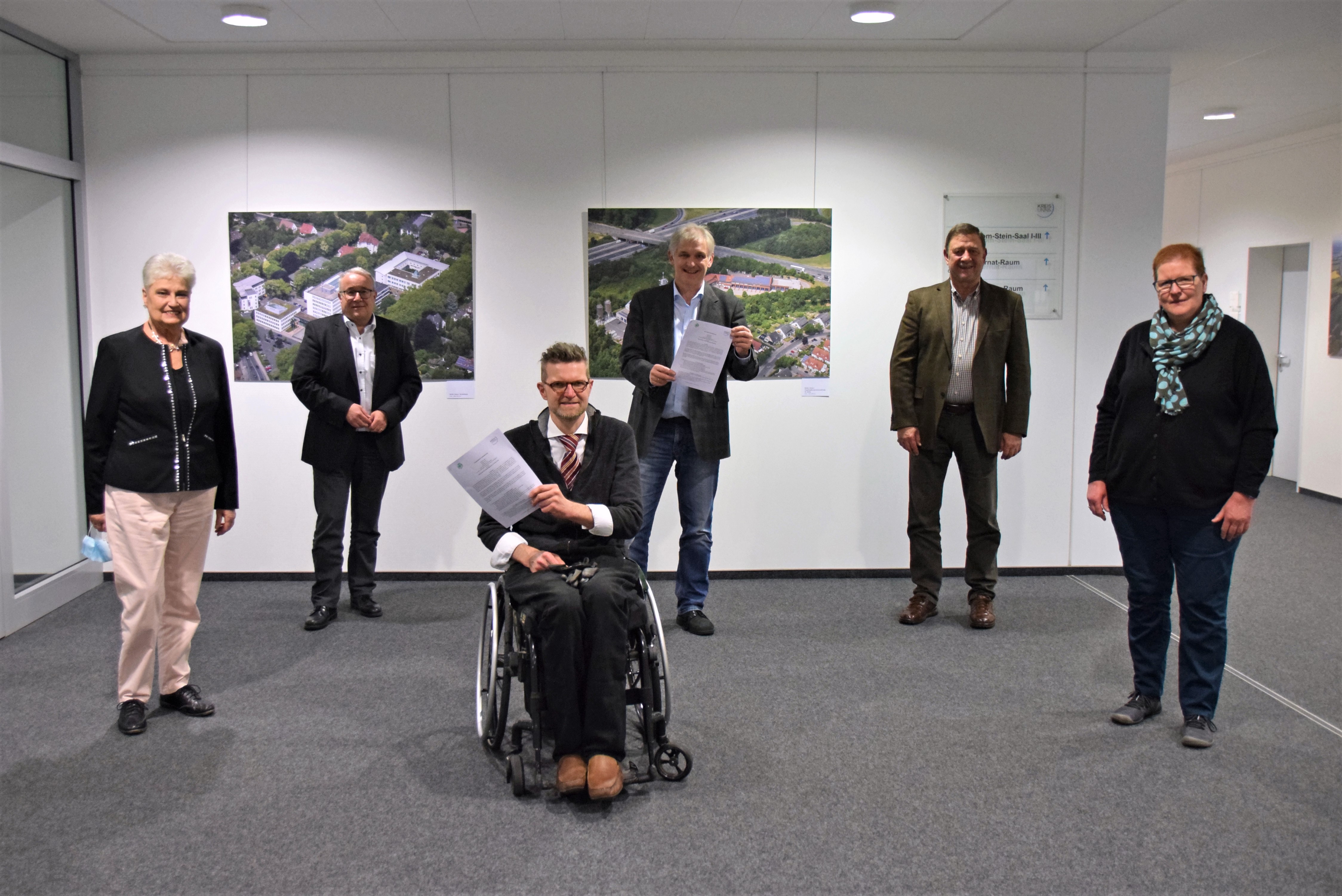 Anne Schrei, Christian Baran und Bettina Borghardt vom Sprecherrat der Selbsthilfegruppen (v.l. vorne) unterzeichneten die neue Kooperationsvereinbarung mit Gesundheitsdezernent Uwe Hasche, Landrat Michael Makiolla und Fachbereichsleiter Gesundheit Josef Merfels (v.l. hinten)