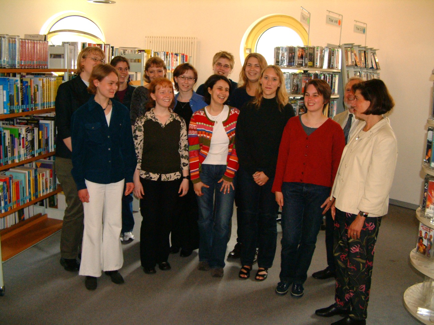 Studenten der Fachhochschule Köln ließen sich von Cornelia Berg (r.) die Stadtbibliothek im Glashaus erklären.
