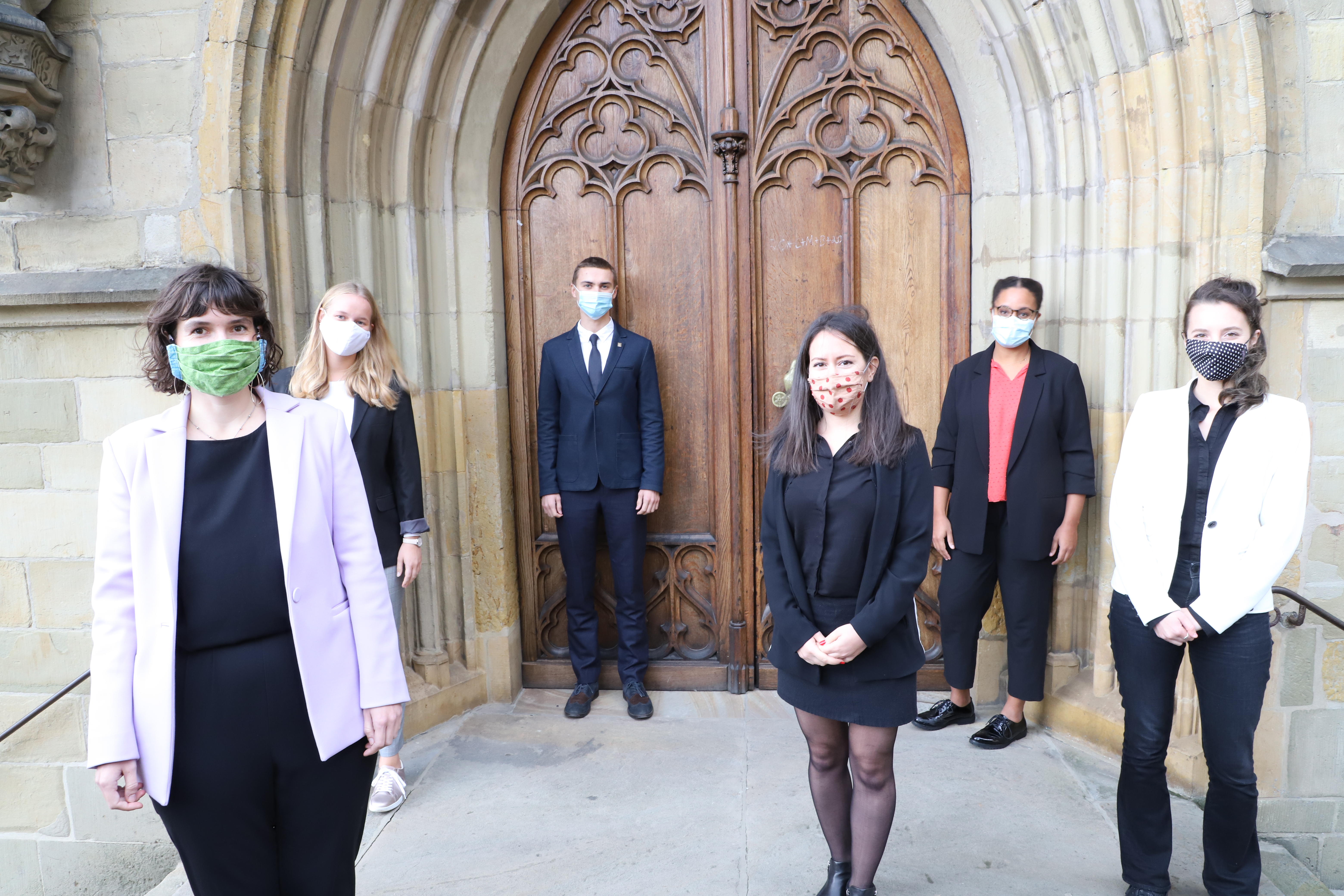 Die neuen Städtebotschafterinnen und Städtebotschafter vor der Rat-haustür: Zoë Chaffey (Derby. links), Merle Nolting (FSJ), Sergey Loginov (Twer), Neşe Yıldız Kendibaşına (Çanakkale), Lauriane Wolf (Angers) und Me-lissa Biesmans (Haarlem). Foto: Stadt Osnabrück, Silke Brickwedde