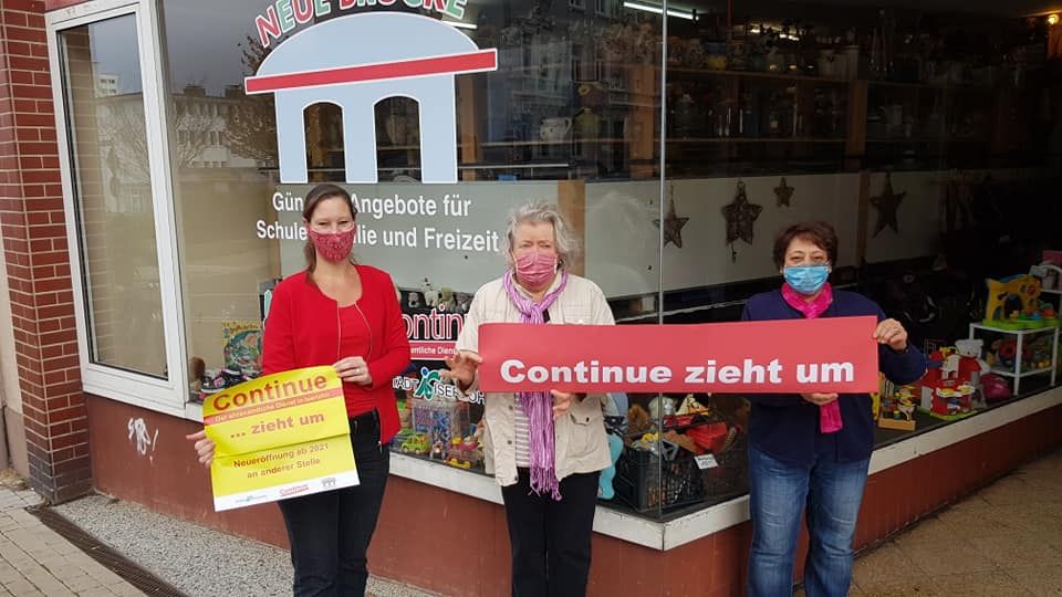 Continue-Koordinatorin Nicole Behlau (links) und die beiden ehrenamtlichen Ansprechpartnerinnen Anne Kowski und Germaine Bödingmeier (rechts) weisen auf den Umzug des Haushaltswarenbereichs von „Continue“ zum Jahresende hin.