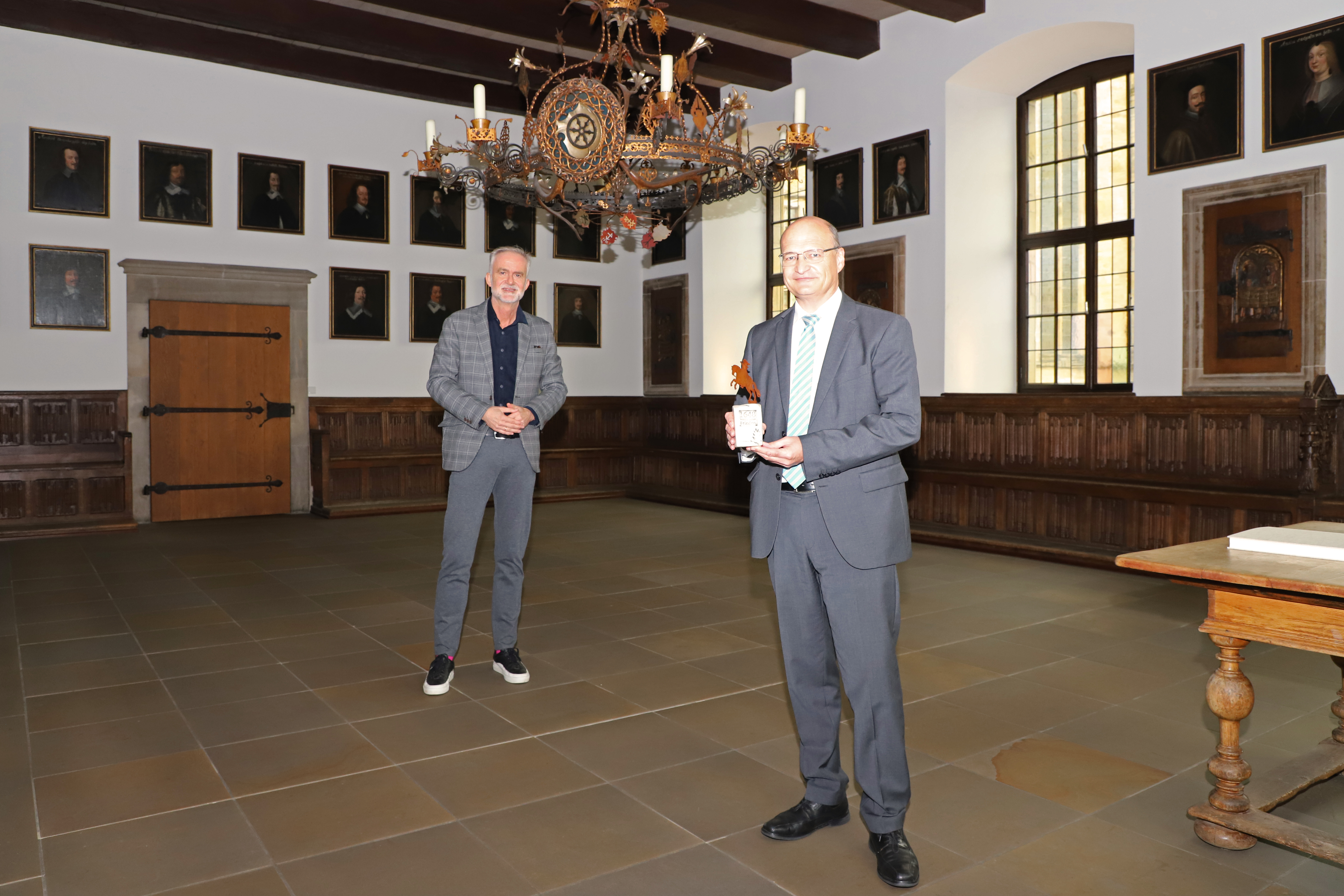 Oberbürgermeister Wolfgang Griesert (links) überreichte Dr. Martin Sommer, dem neuen Landrat des Landkreises Steinfurt, im Friedenssaal des historischen Rathauses die Figur eines Friedensreiters.