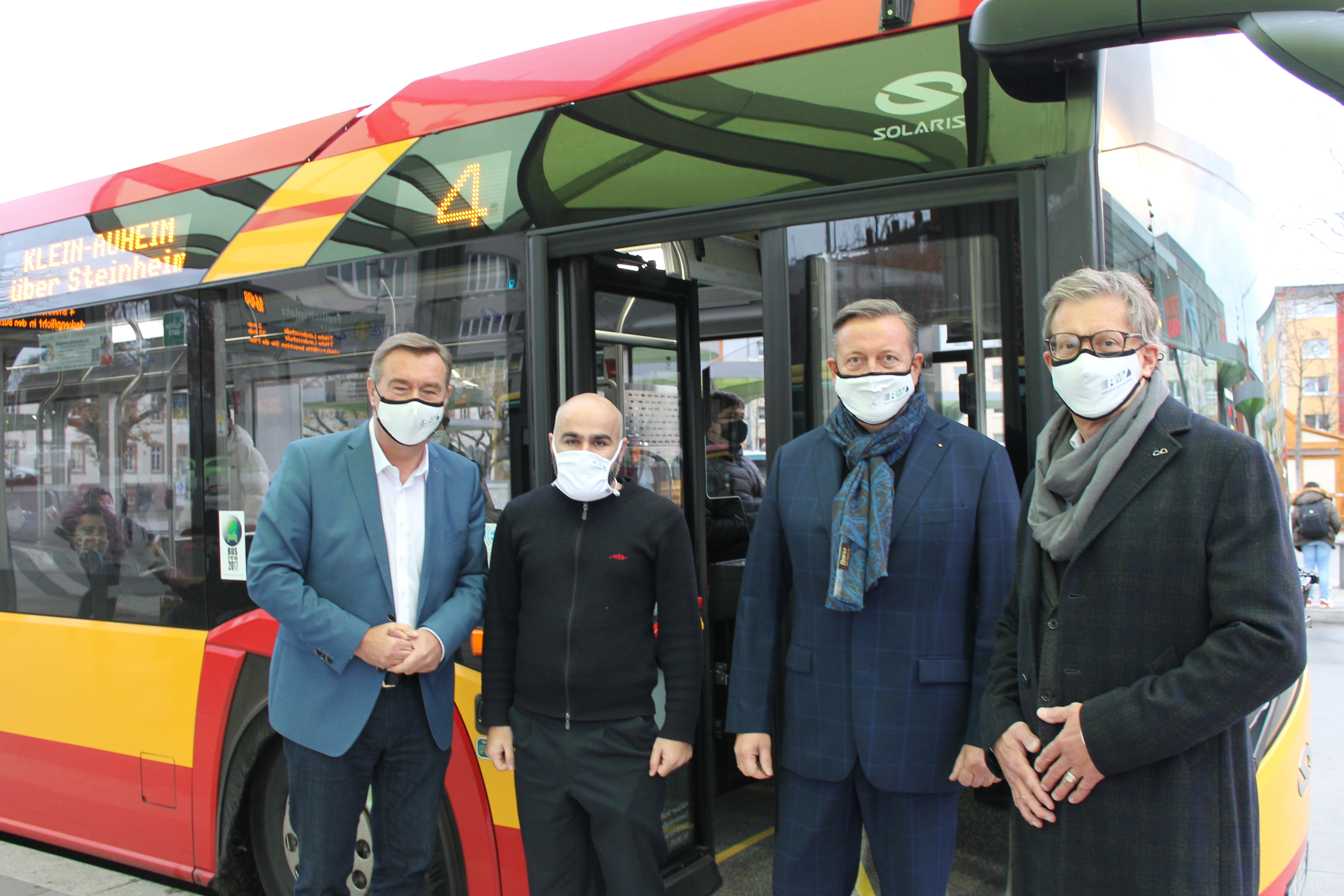 RMV-Geschäftsführer Professor Knut Ringat freut sich mit Stadtrat Thomas Morlock, HSB-Busfahrer Aden Ahmed und Oberbürgermeister Claus Kaminsky (von rechts) darüber, dass auch städtische Beschäftigte in Hanau künftig in den Genuss des RMB-Jobtickets kommen.