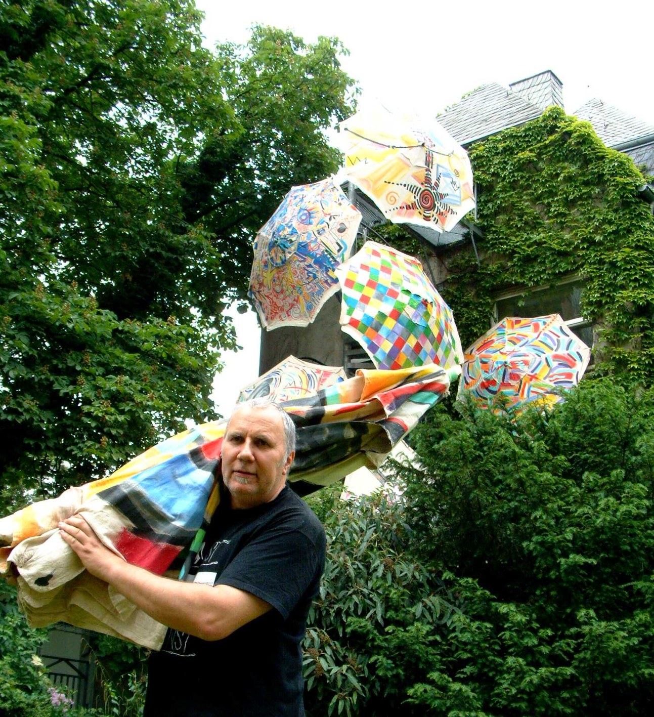 Peter Grzan lässt gemeinsam mit dem Kulturbüro der Stadt Herten die farbenfrohen Schirme an verschiedenen Stellen im Stadtgebiet auftauchen.