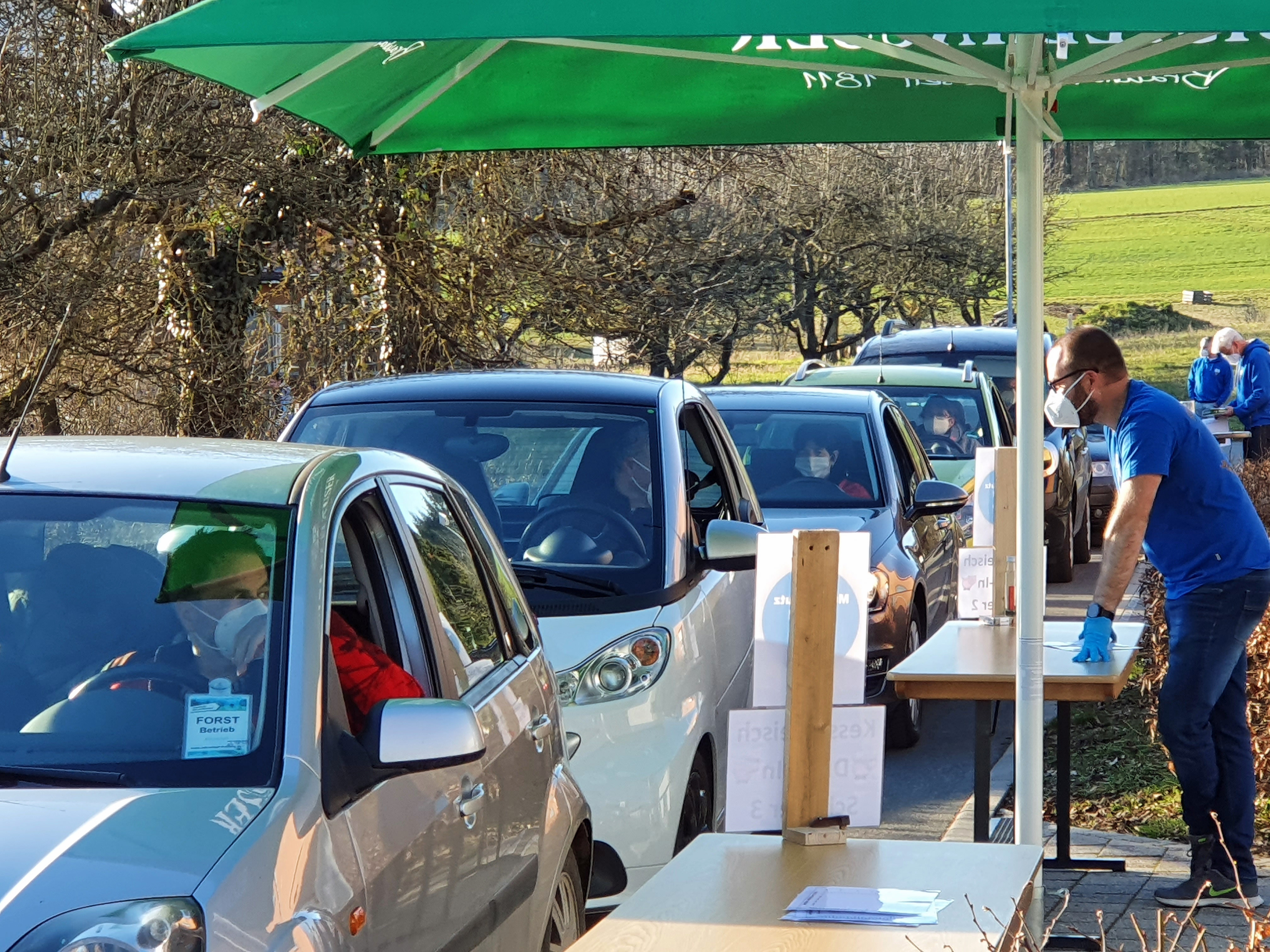 Beim Höhefelder Kesselfleisch-Drive-In war der Andrang groß. Auch OB Markus Herrera Torrez holte sich seine Portion ab. Foto: Stadt Wertheim
