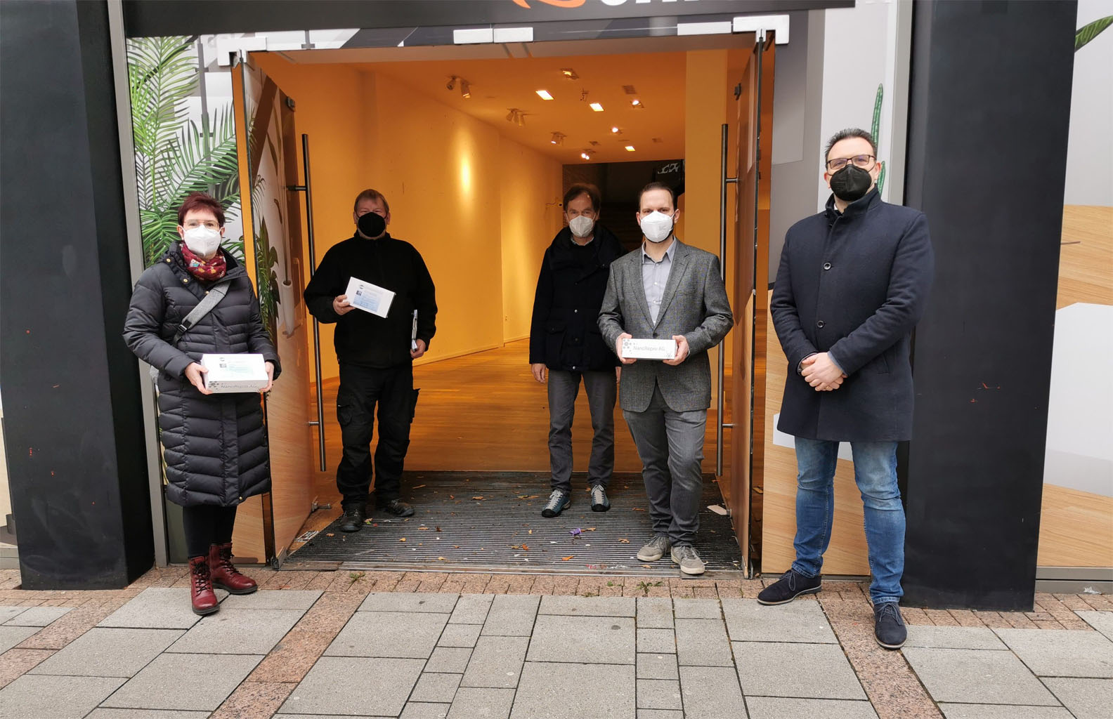 Die privaten Initiatoren und Bürgermeister Joithe vor dem Ladenlokal in der Unnaer Straße, in dem bald Schnelltests angeboten werden sollen.