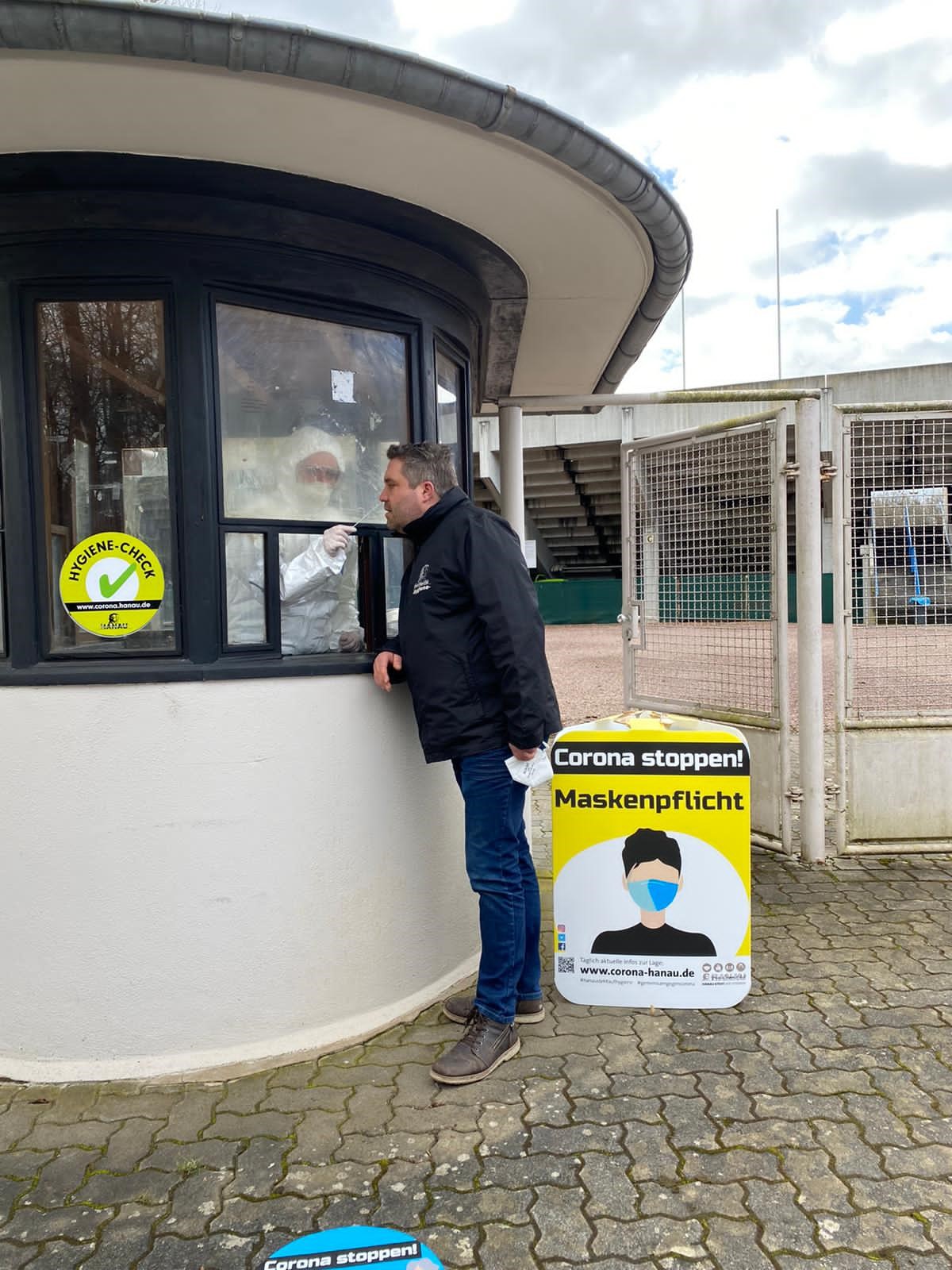 Sven Holzschuh vom Hanauer Hygiene-Team an der neuen Corona-Schnelltest-Stelle vorm Herbert-Dröse-Stadion an der Burgallee.