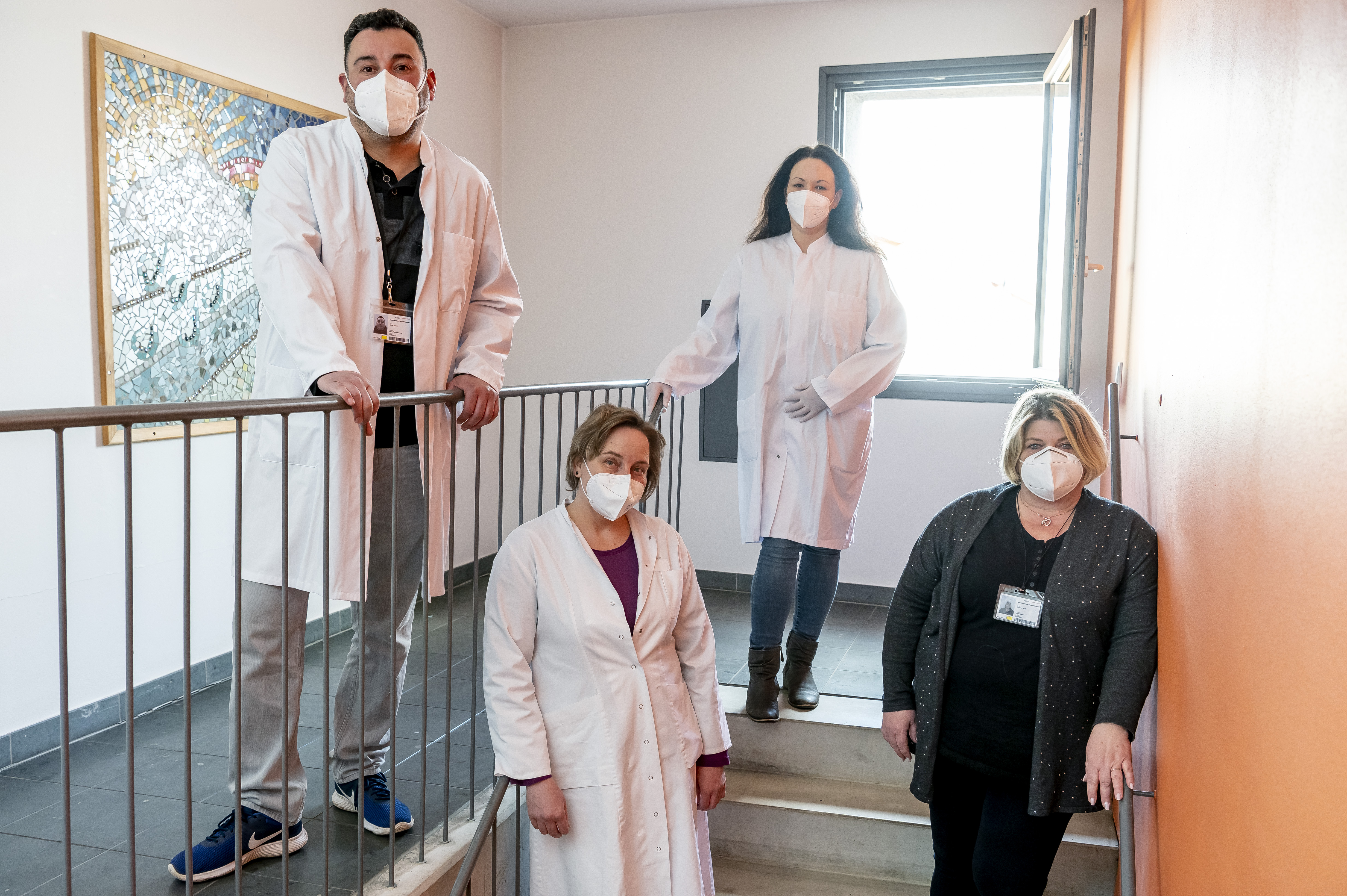 Der 100. Einsatz: Das mobile Team Driss Nassiri (MFA, von links), Dr. Claudia Ludolph, Julia Thöne (PTA) und Simone Wolf (Verwaltung) impften die Bewohnerinnen und Bewohner der Senioren-Wohngemeinschaft Haus Anna. Foto: Stadt Kassel/Bernd Schoelzchen