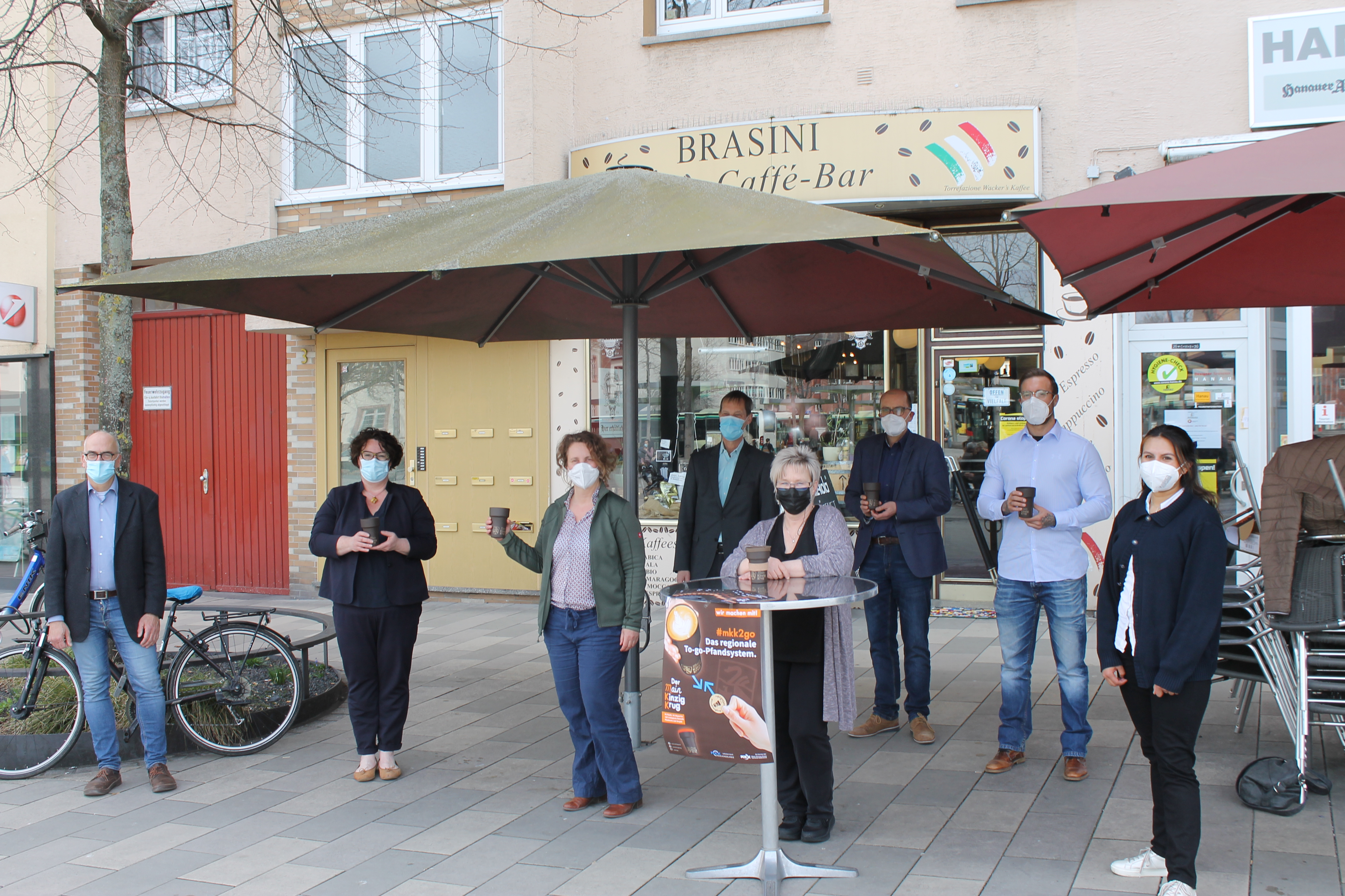 Beteiligte an der Aktion Main-Kinzig-Krug mit der Ersten Kreisbeigeordneten Susanne Simmer und Hanaus Stabsstellenleiterin Anja Zeller (Zweite und Dritte von links) an der Spitze.