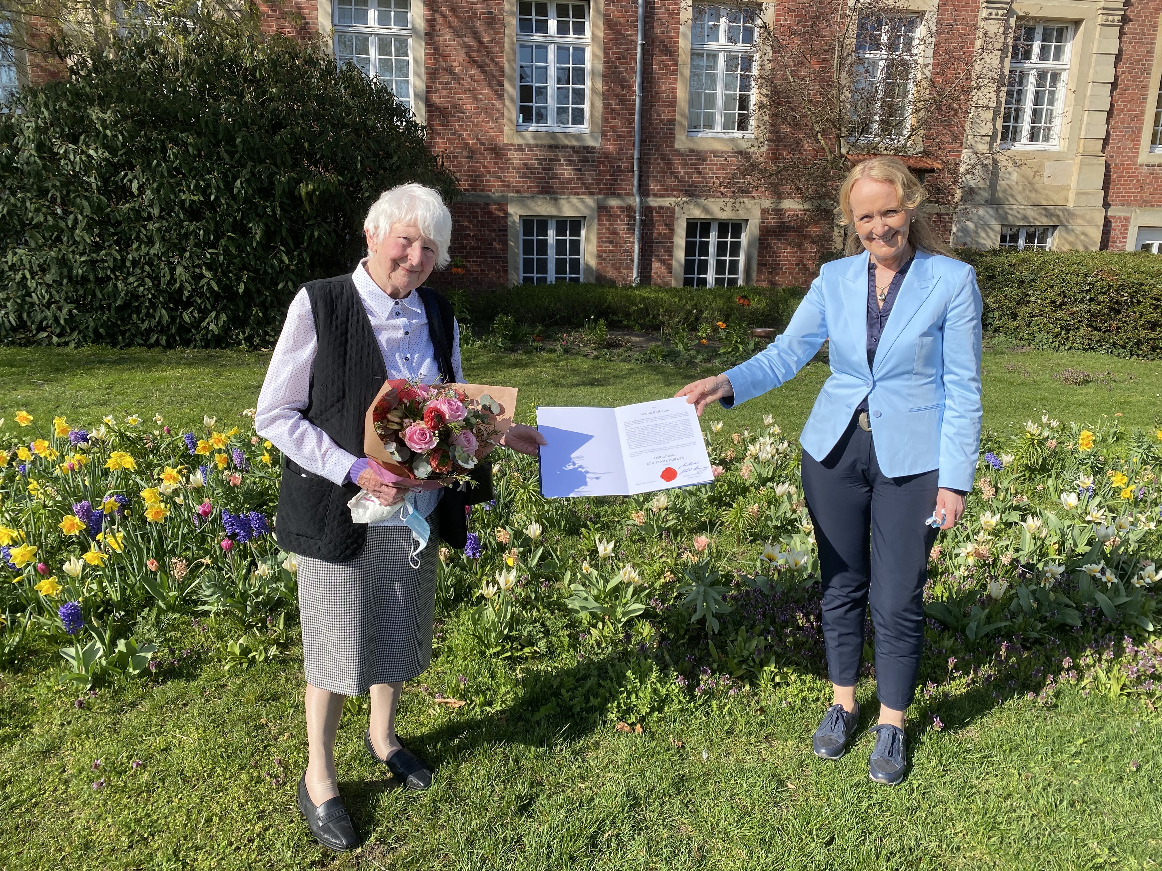 Für das Bild haben die coronageimpfte Ursula Brebaum und die negativ schnellgetestete Bürgermeisterin Mechtild Schulze Hessing ihre Mssken abgenommen.