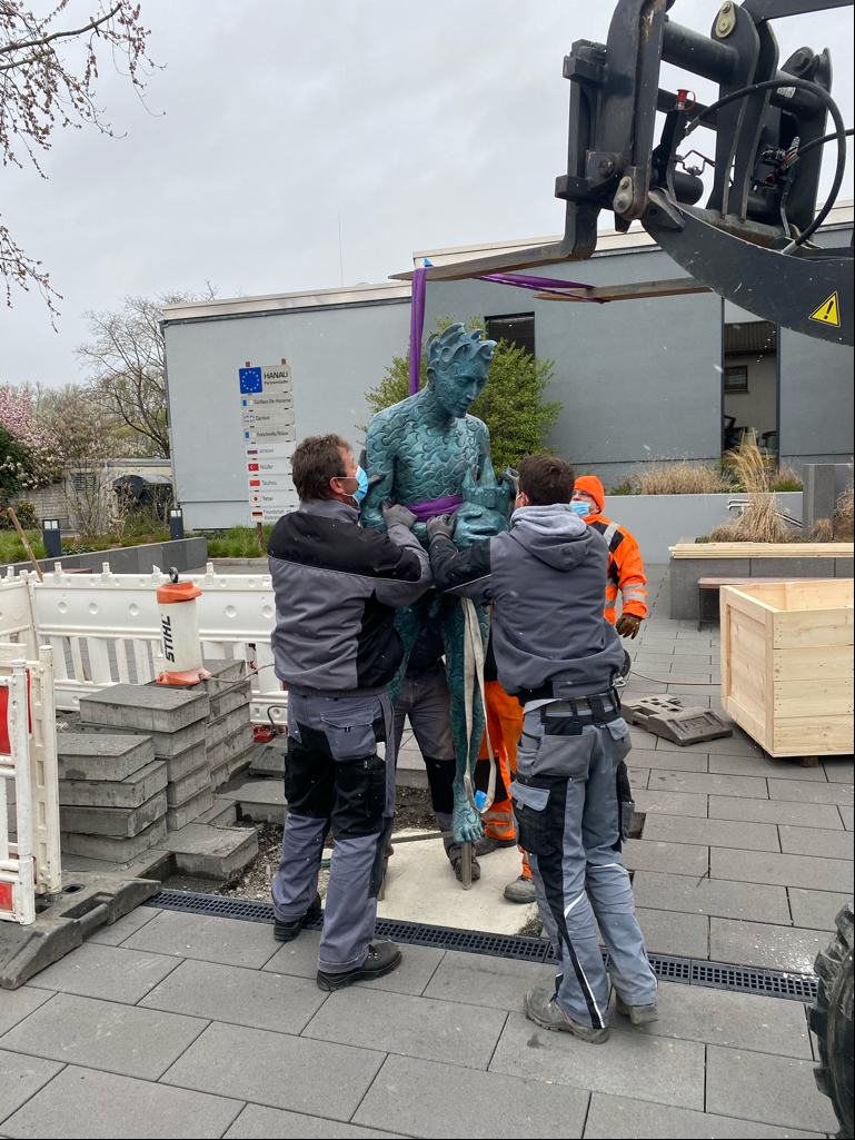 Das Bild zeigt die Stellprobe der Skulptur in der vergangenen Woche. Seinen endgültigen Platz erhält der Flussgott erst kurz vor der Einweihung im Juni.