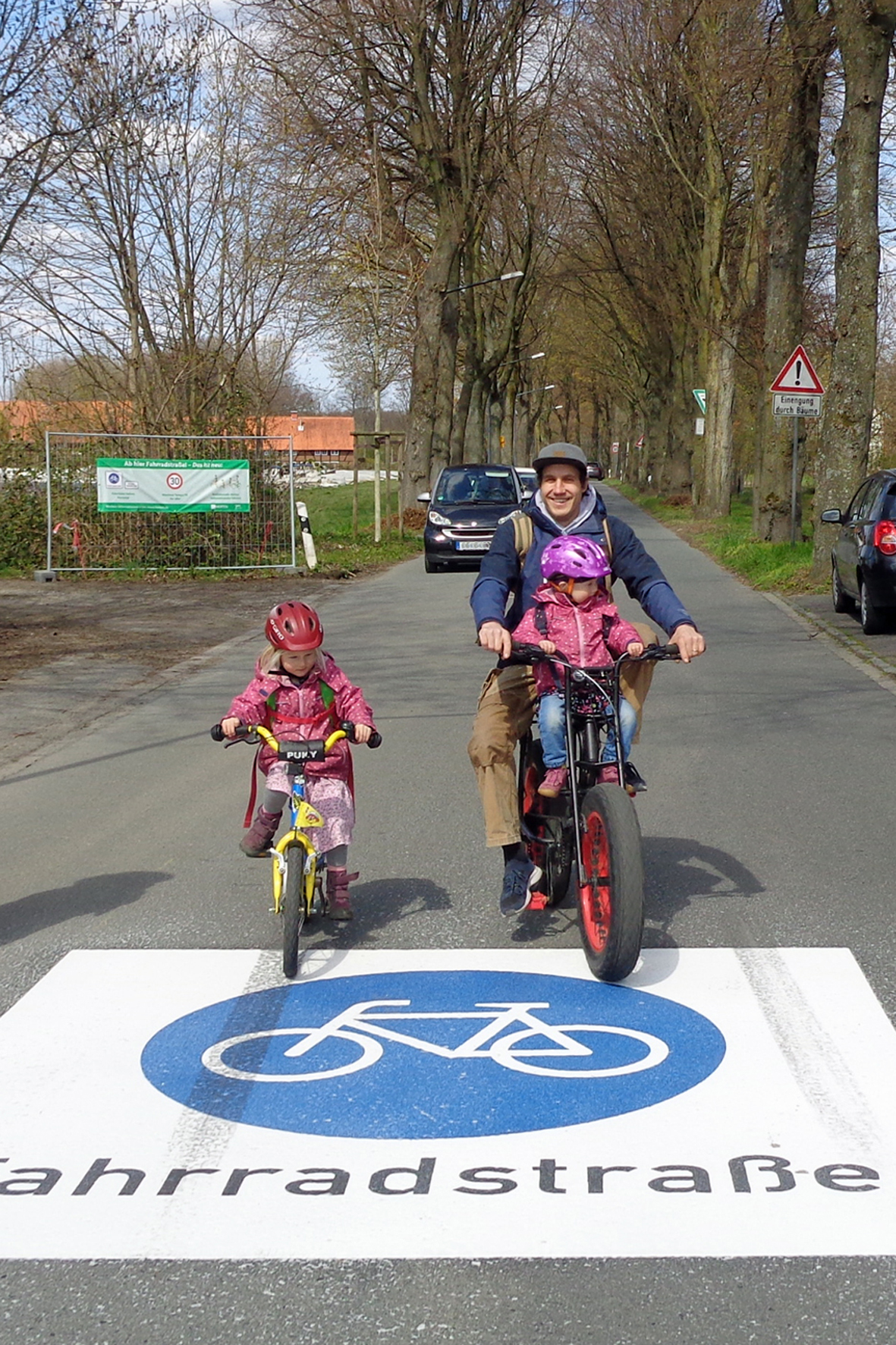 Raphael Laarmann-Schlewinski und seine Töchter Frieda und Leen gehörten zu den ersten Radfahrenden auf den neuen Fahrradstraßen.
